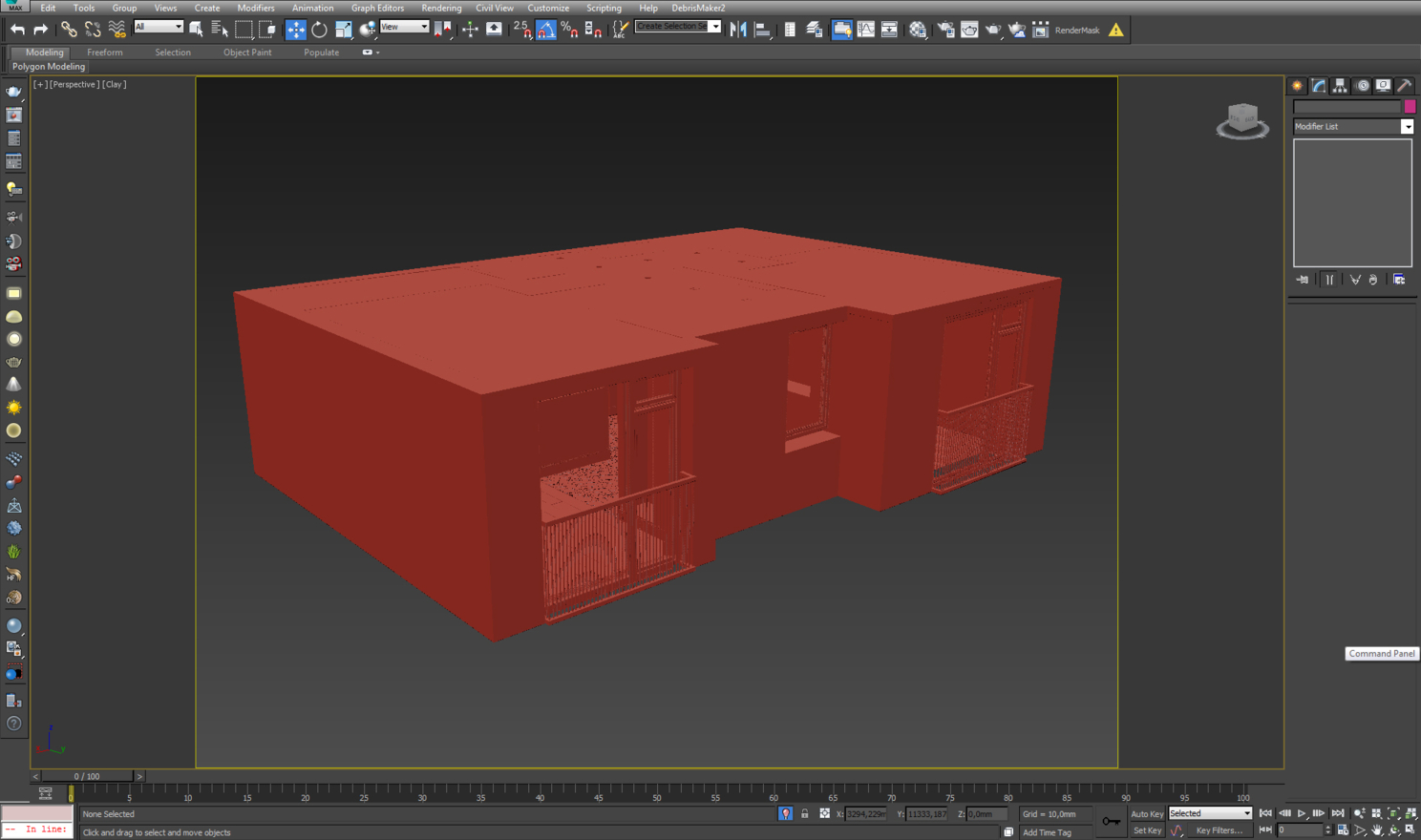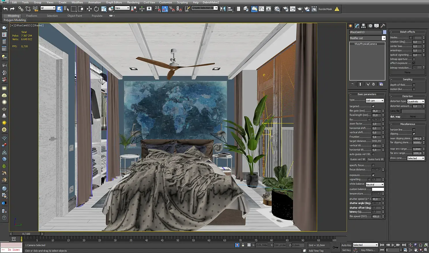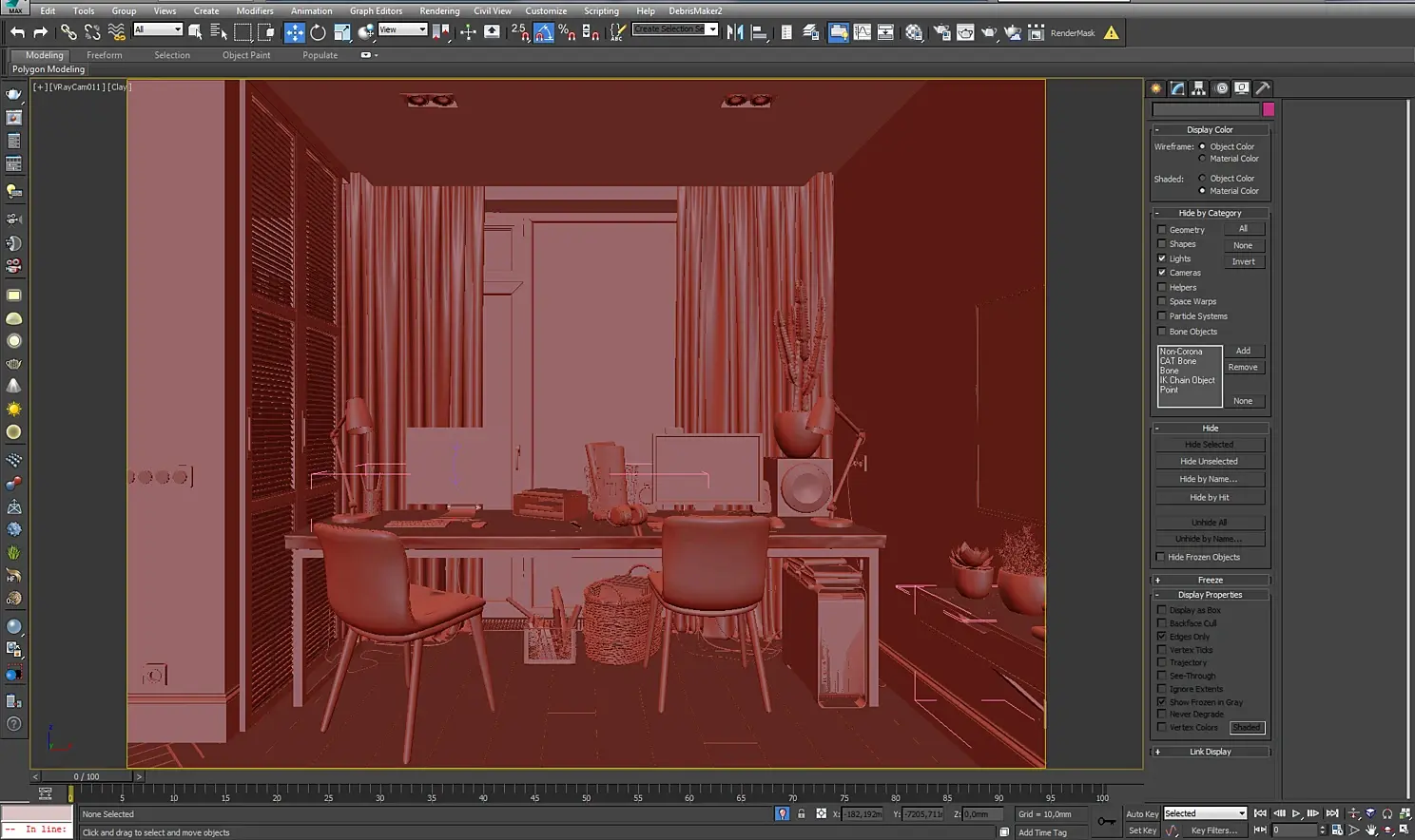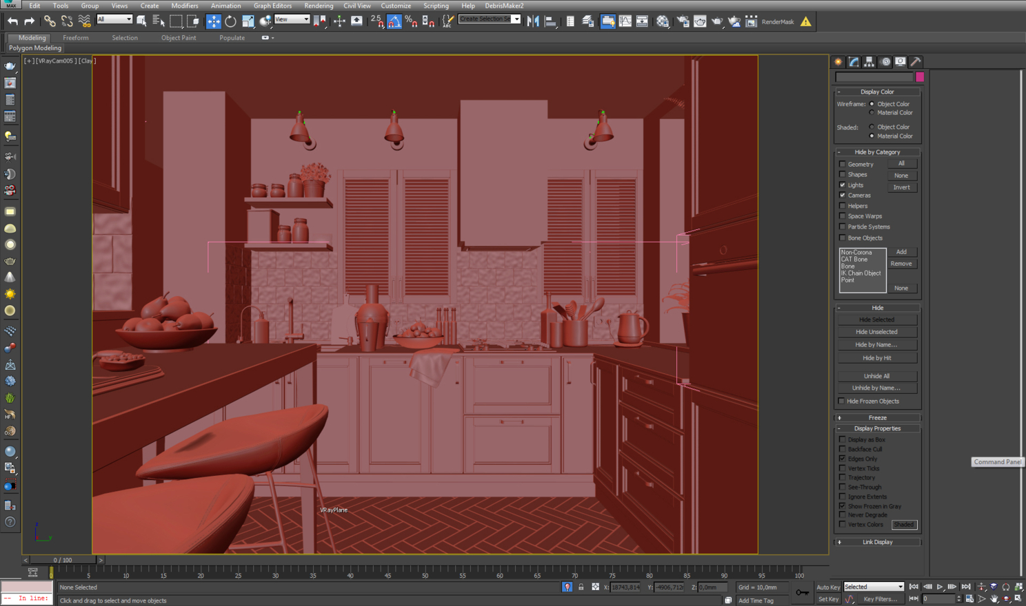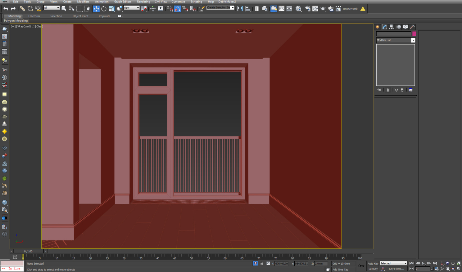 Так как я изначально планировал много ракурсов, хотел показать обеденные помещения, то я построил коробку всей квартиры и уже потом делил ее на помещения таким образом, чтобы можно было делать кадры из коридора с открытыми дверьми.