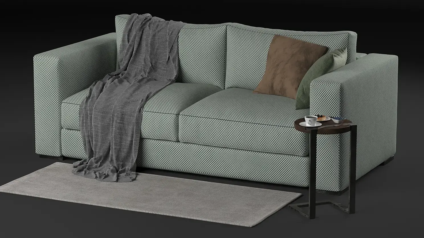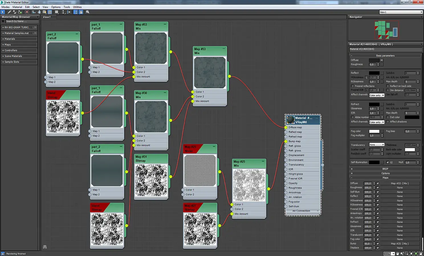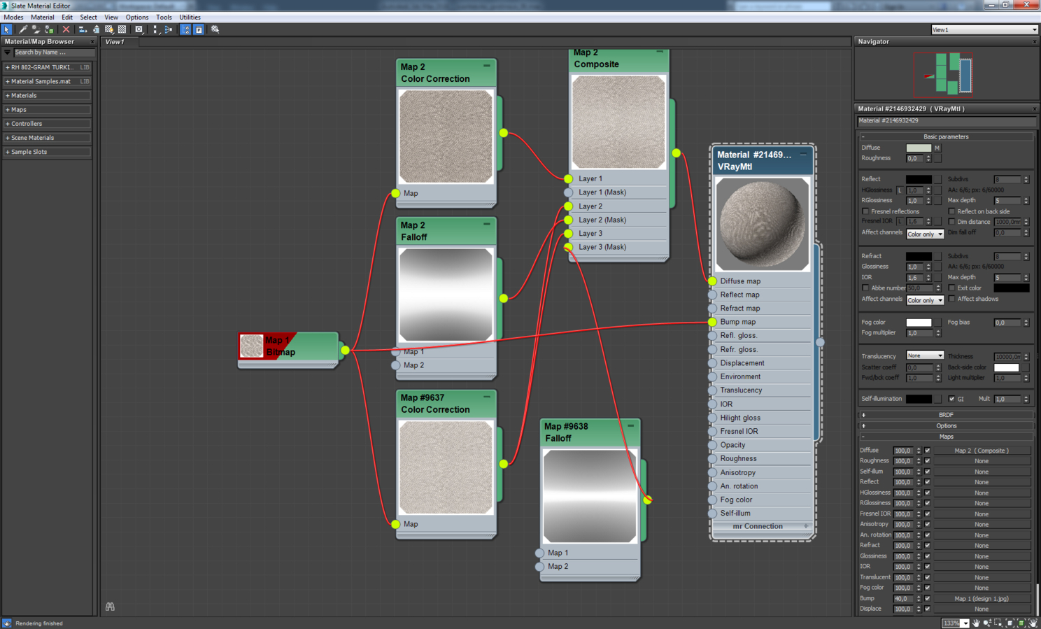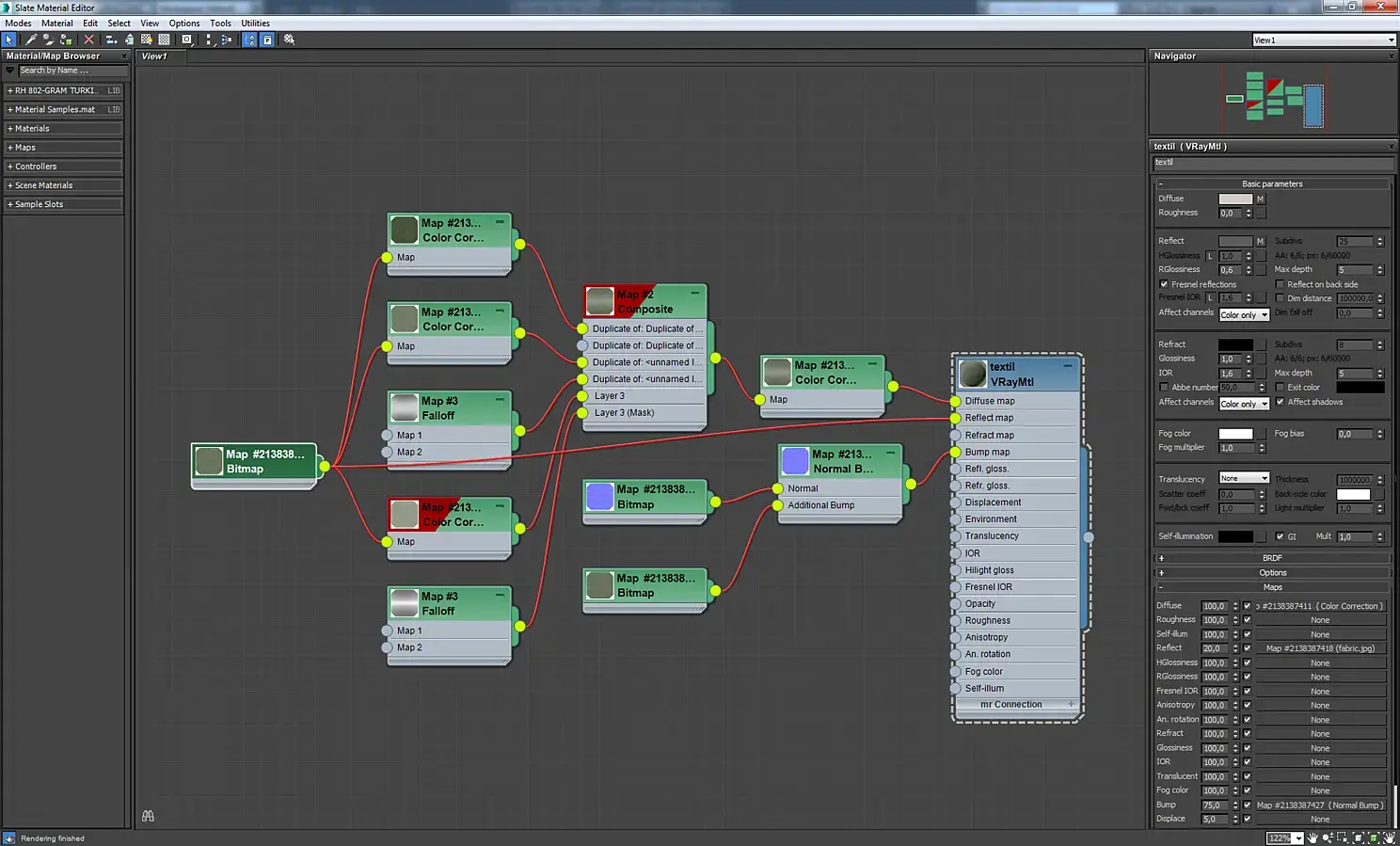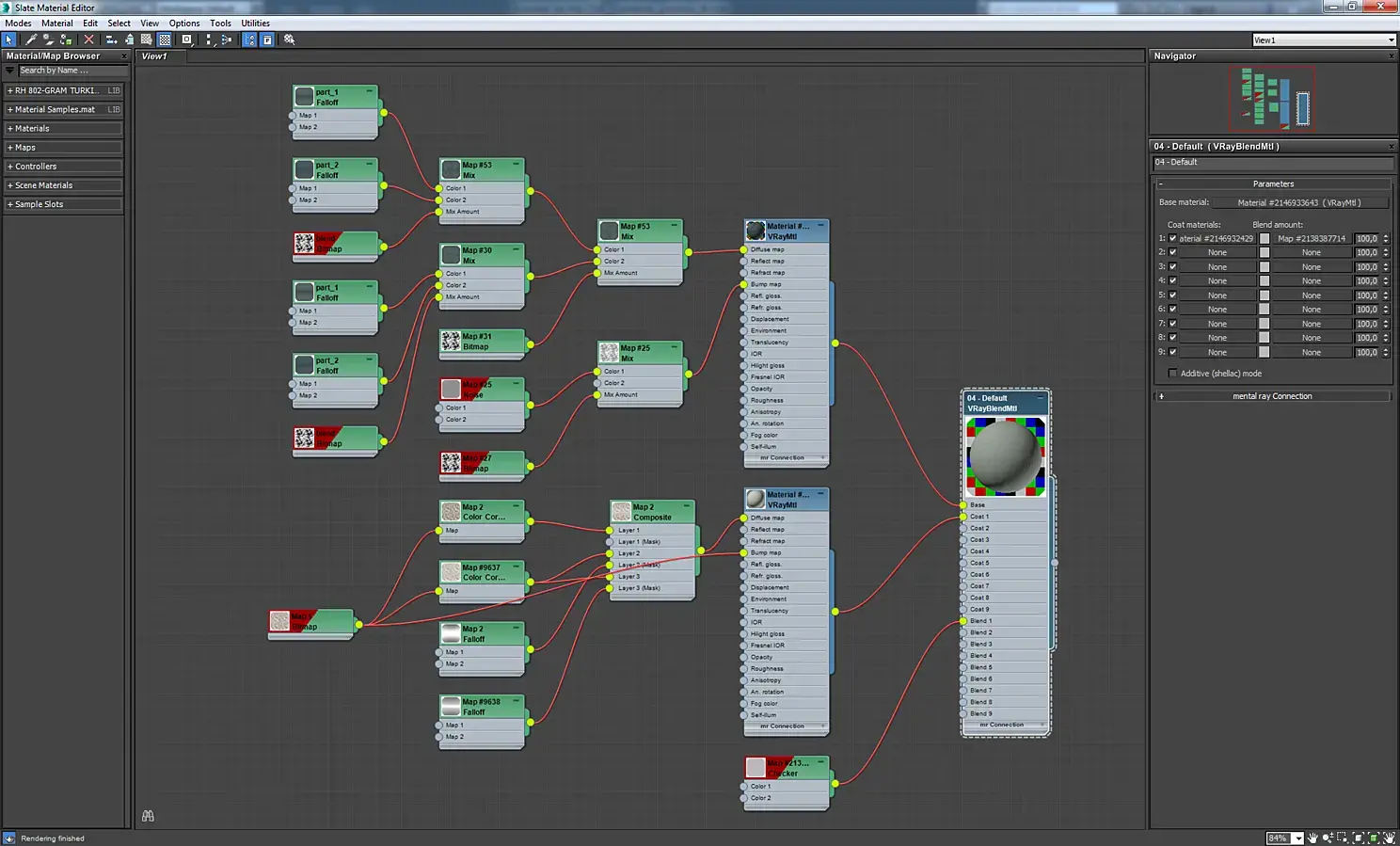 Материал ткани на диване. Он может показаться сложным, но на самом деле там все просто. Это vrayblendmtl, где смешиваются материал замши и рогожки с помощью карты checker.