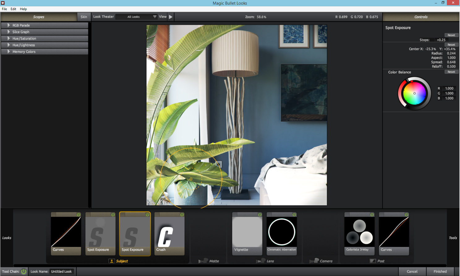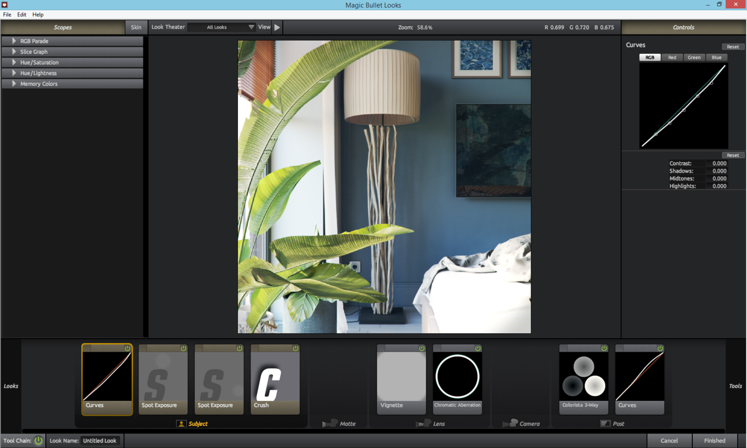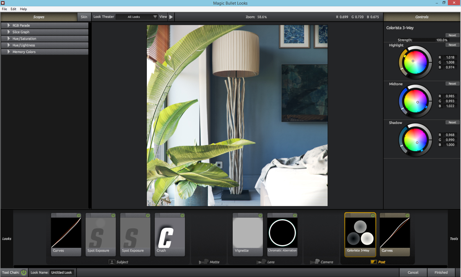 После этого объединяю слои и применяю плагин Magic Bullet Looks. В этом плагине есть много готовых фильтров для обработки изображения (как в Instagram), а также можно создать свой собственный. На скриншотах показан мой фильтр.