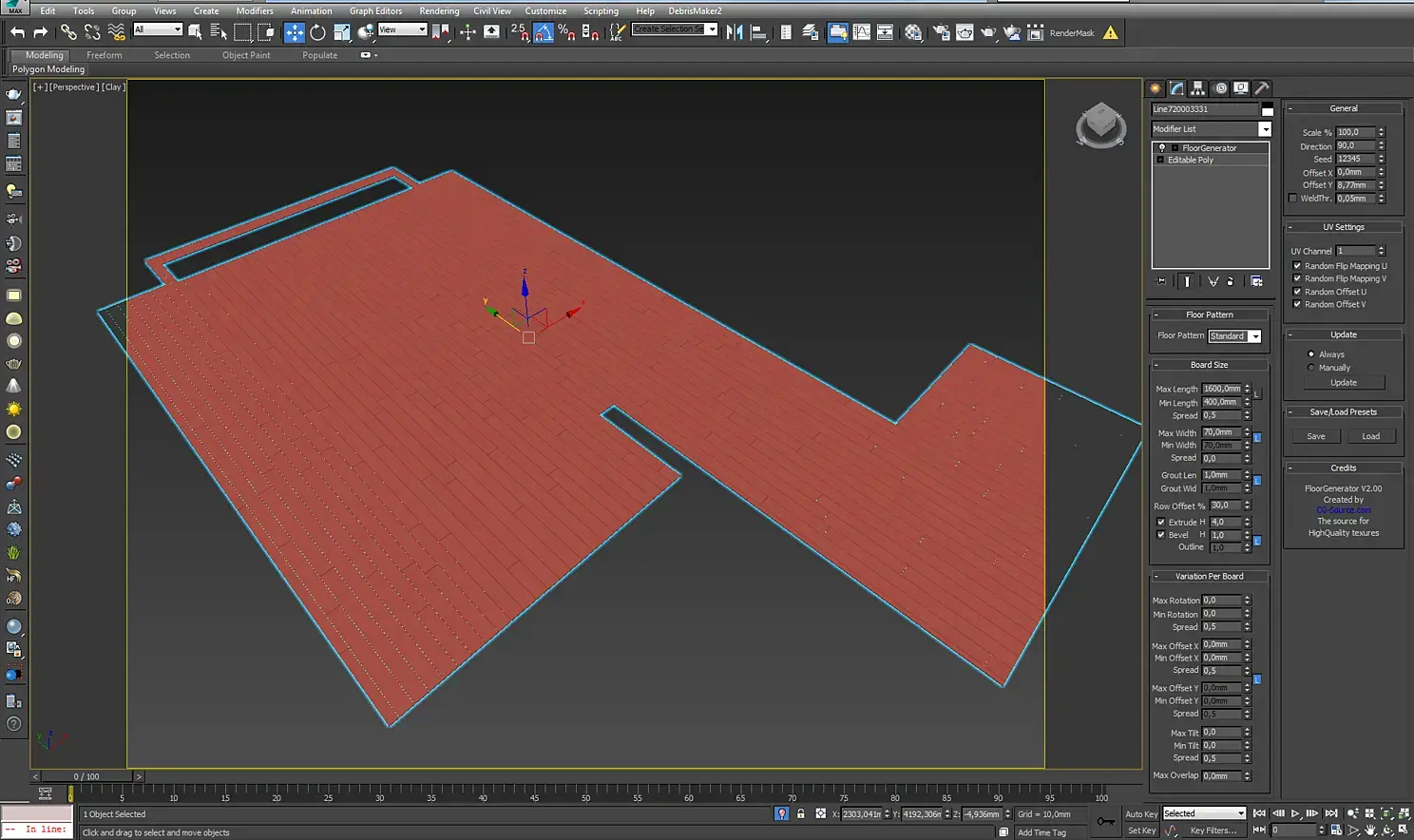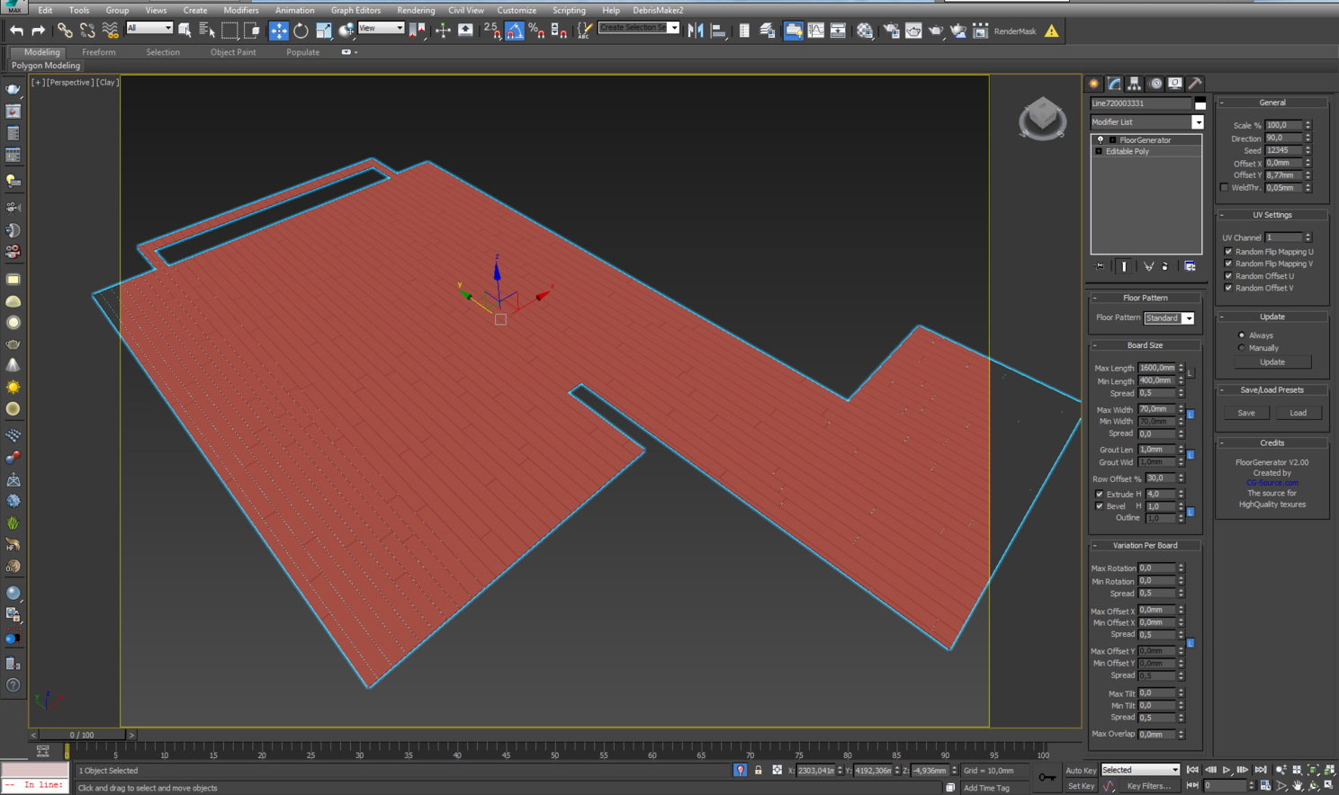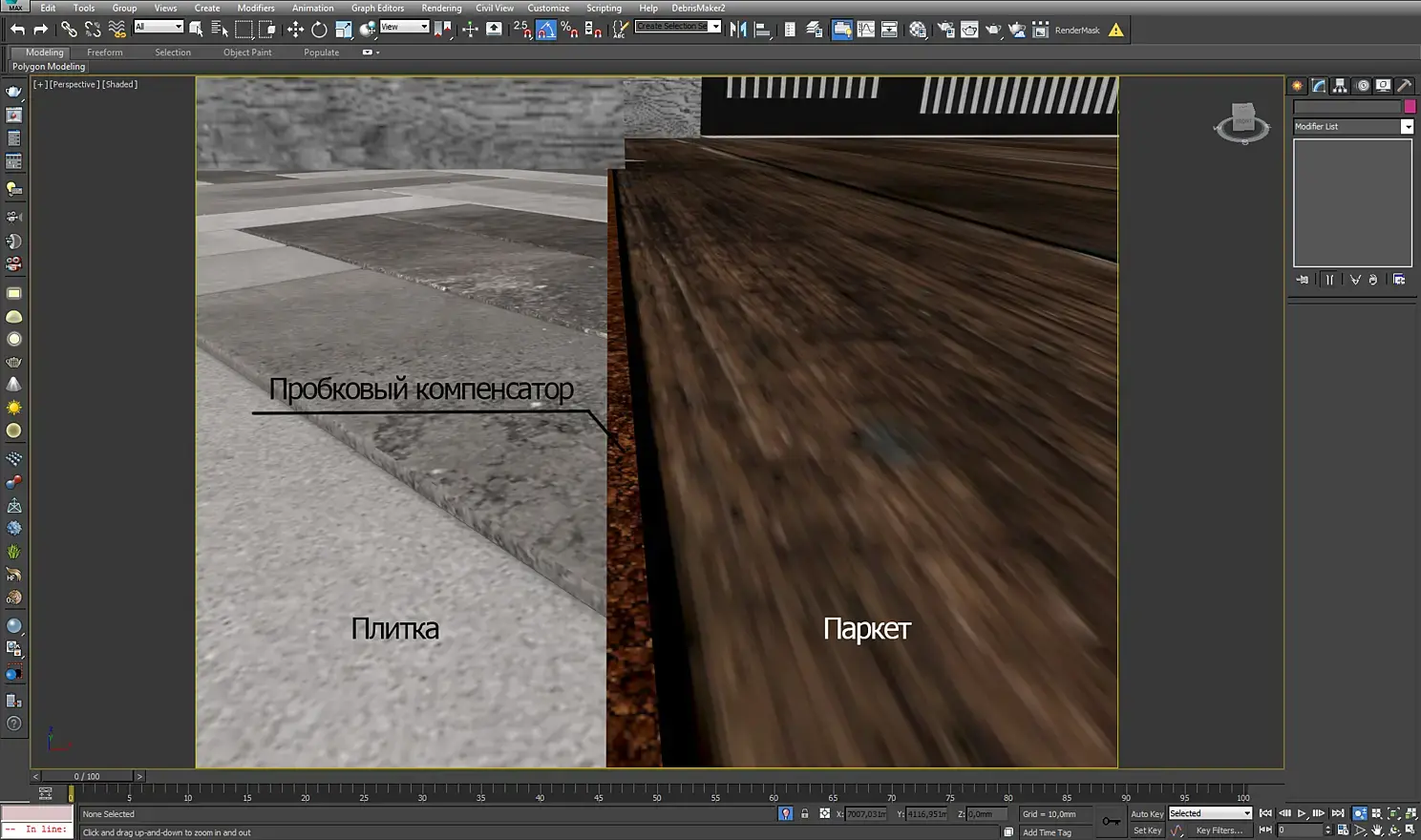 Паркет я делал с помощью плагина floor generator. Ничего сложного. Плитка так легко не сдавалась. Из-за непростой раскладки, ее я делал вручную. Я сделал заготовку из box'а, добавил поддерживающие ребра и применил модификатор turbosmooth, чтобы получить гладкие края. После этого копированием создал нужную раскладку. Везде соблюдал пространство между плитками в 2 мм, чтобы потом сделать затирку. Лишнюю часть плитки на стыках с паркетом обрезал с помощью boolean. На стыке плитки и паркета я сделал пробковый компенсатор.