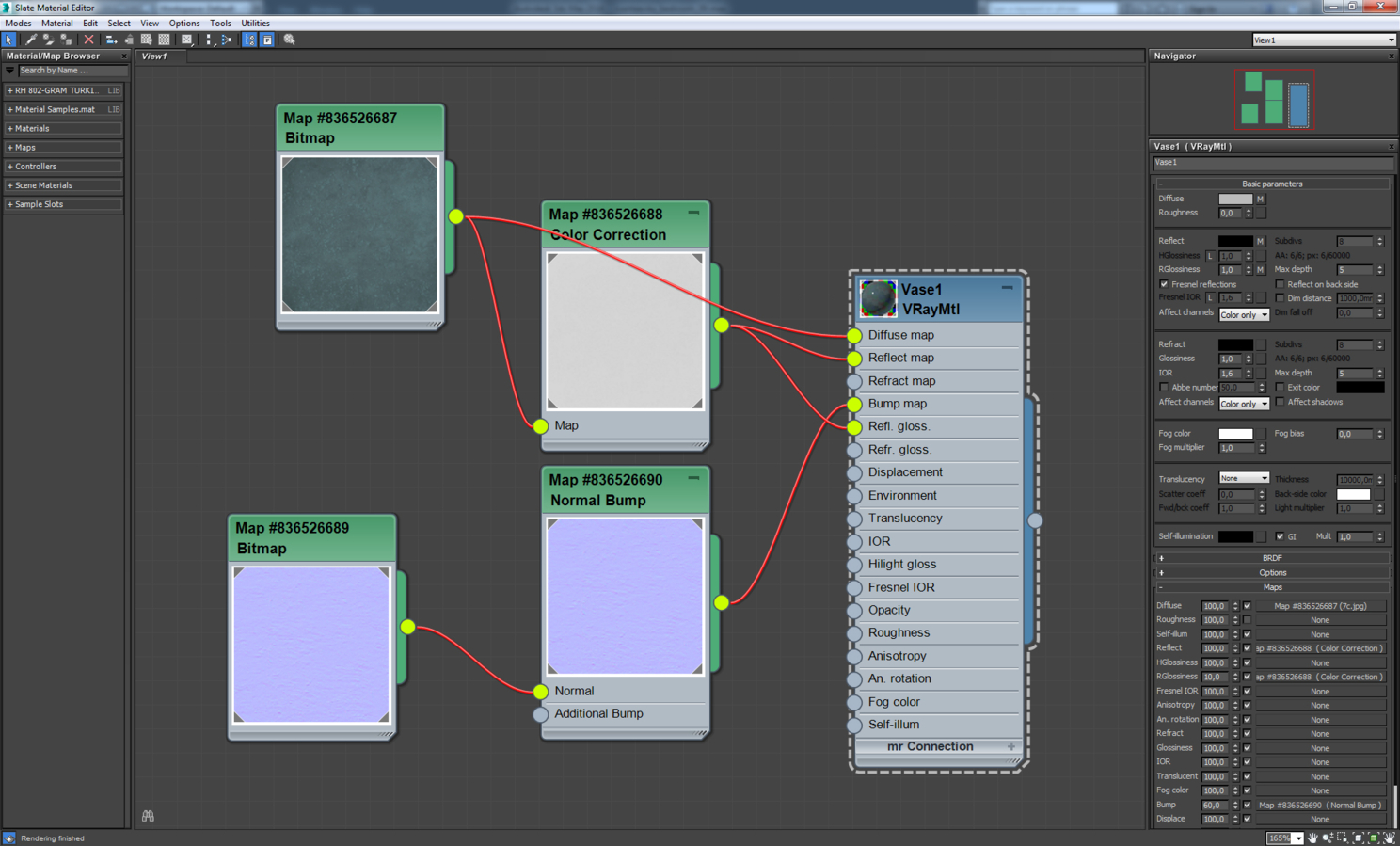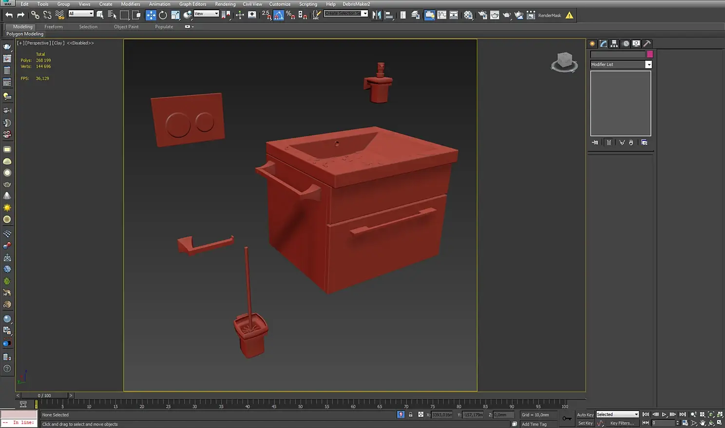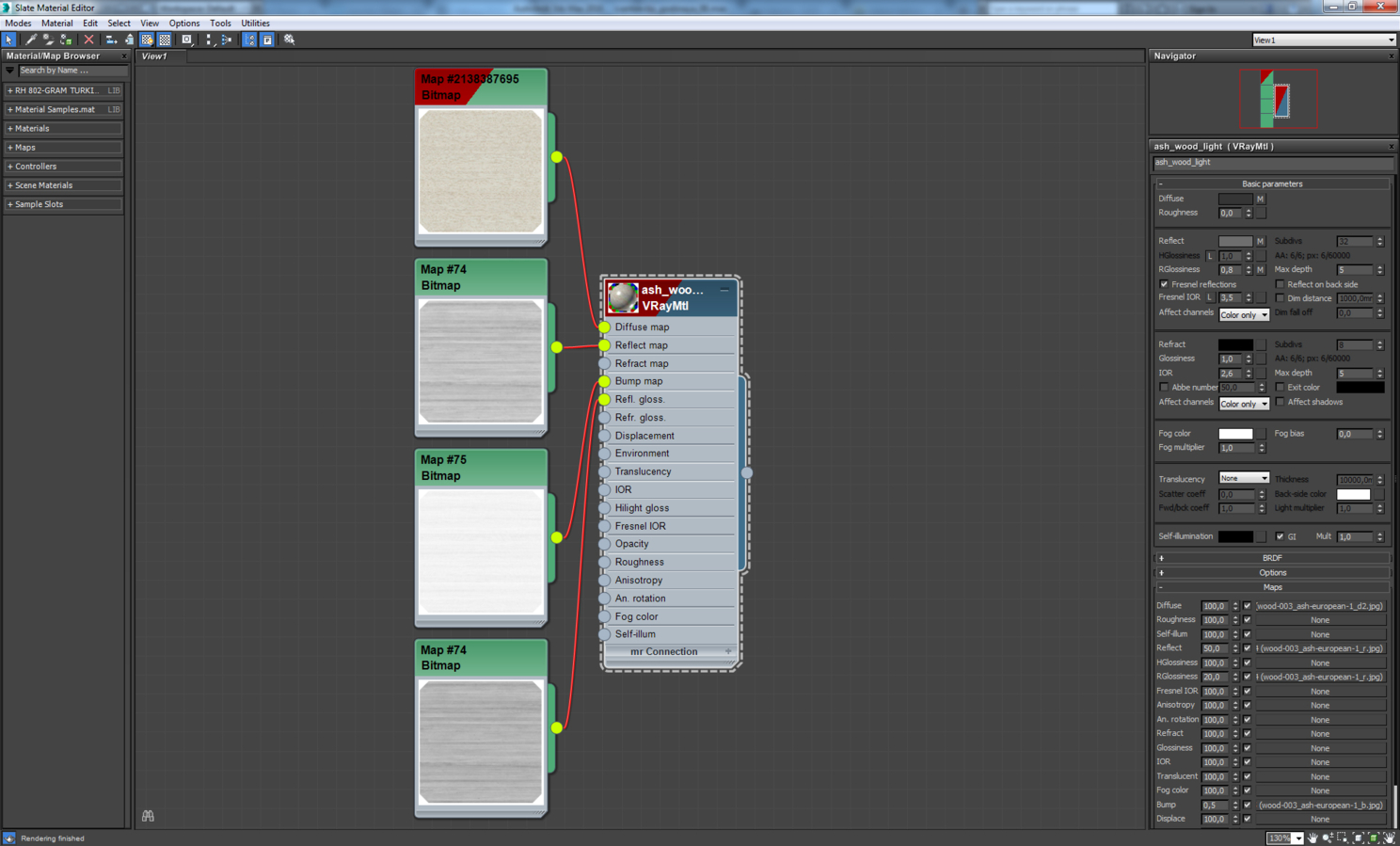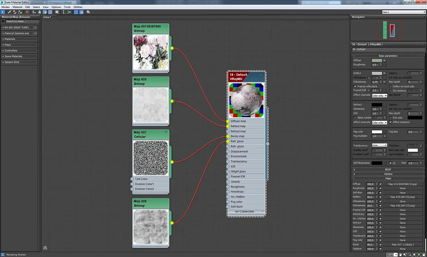 Большинство объектов в сцене имеют простое текстурирование — это модификатор uvw map в различных режимах. Материалы в сцене настраивались по одинаковой схеме: карты diffuse, reflection, bump. Для сложных материалов использовался vrayblendmtl, состоящий из нескольких слоев. Также было сделано много текстур плитки, паркета, грязных разводов от цветочных горшков, разводов вокруг слива у раковины, следов от капель на стекле в душевой. Самые интересные материалы, на мой взгляд, покажу ниже на скриншотах.