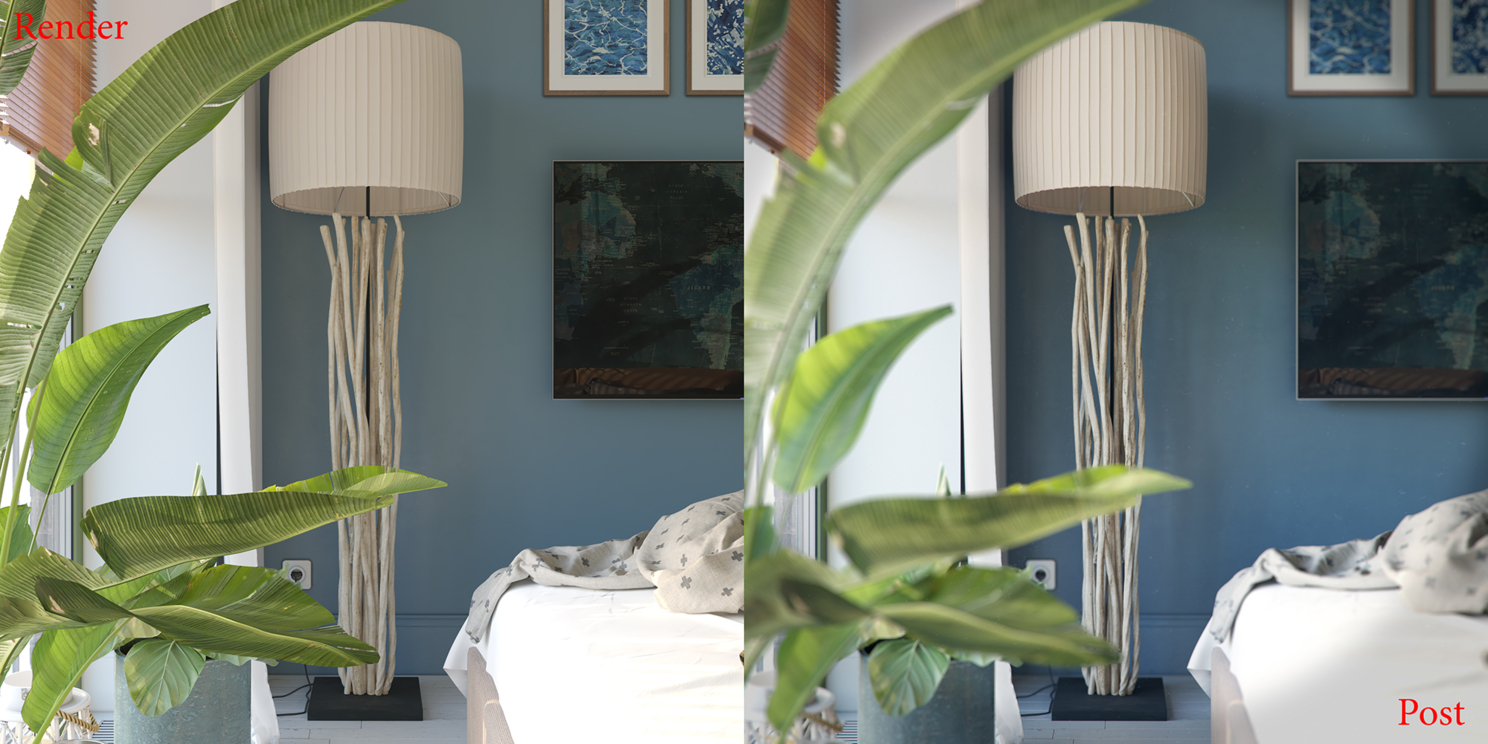 После этого, возвращаюсь в режим normal blur. В поле depth layer указываю наш VrayZDepth рендер-элемент. Устанавливаю силу размытия в поле radius и указываю точку фокуса с помощью инструмента select depth.