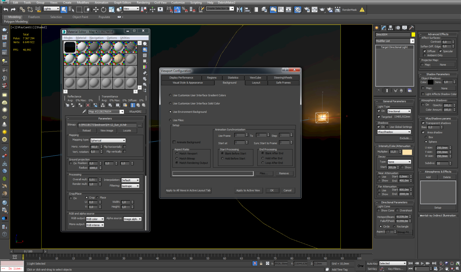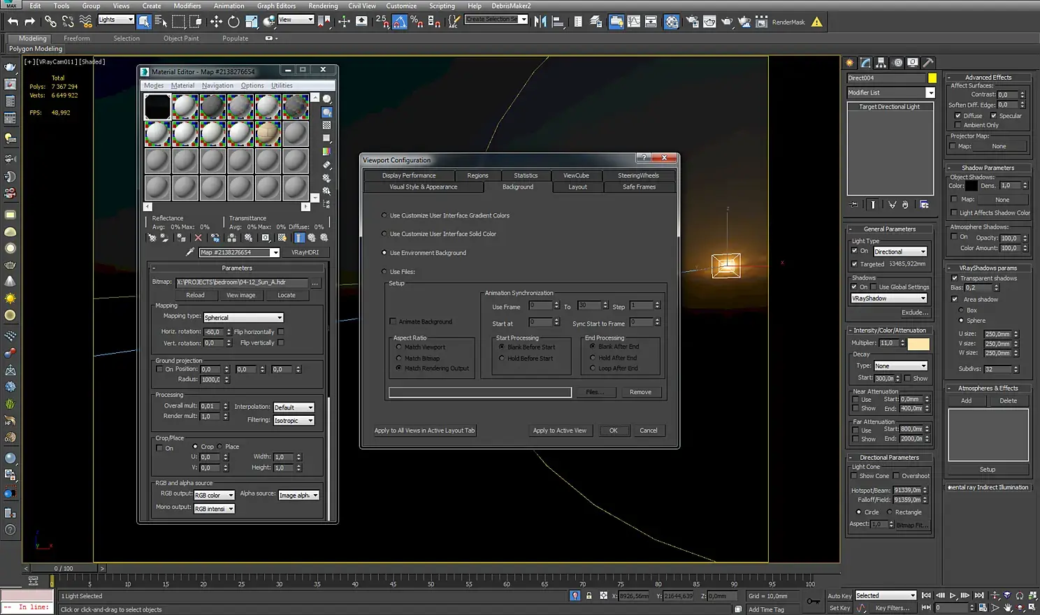 Чтобы это исправить, я добавил в сцену target direct light и совместил его положение с положением солнца у HDR карты. Чтобы это сделать, открываем меню viewport configuration (views - viewport configuration или alt+b), заходим во вкладку background и ставим галочку use environment background. Это заменит наш фон на карту из environment. Затем мы понижаем значение overall mult до очень низких значений, чтобы четко видеть положение Солнца на карте, и совмещаем наш direct light с Солнцем. Когда мы все это сделали, возвращаем на фон viewport'а серый градиент и возвращаем значение overall mult в настройках HDR карты.