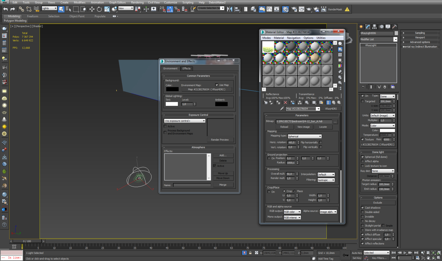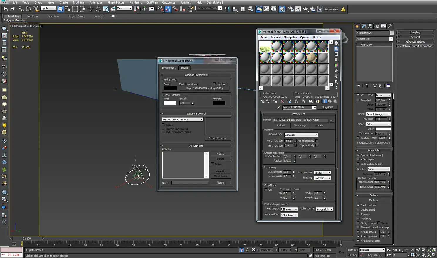 Я хотел добиться уютной атмосферы, передать летний вечер. Чтобы свет от солнца мягко проникал через панорамные окна и создавал интересные тени. Перепробовав разные варианты постановки света с помощью vray sun and sky, перебрав огромное число HDR карт, я остановился на следующем варианте. В окнах стоят skyportal'ы и domelight. Я остановил свой выбор на HDR карте с сайта noemotionhdrs.net. Скачать ее можно по этой ссылке http://noemotionhdrs.net/hdrs/Evening/04-12_Sun_A.rar Я настроил карту и скопировал ее в domelight и environment.