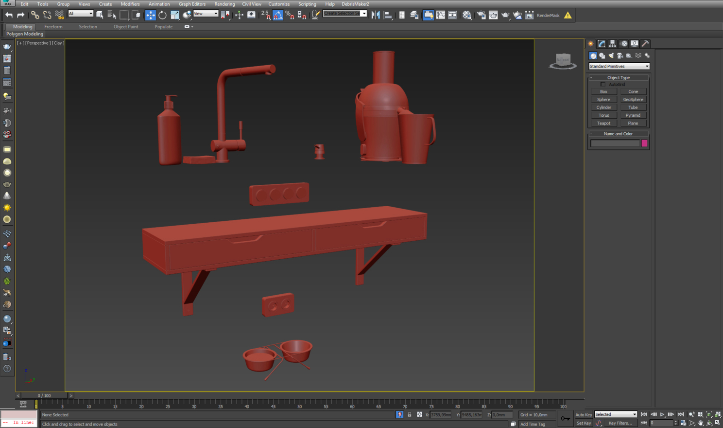 При создании визуализации я старался максимально приблизиться к реальности. Мне были известны все материалы и предметы, которые будут использованы, поэтому те предметы, 3d модели которых не удавалось найти готовыми, я делал самостоятельно. Так, мной были сделаны 3d модели соковыжималки, межкомнатных дверей, розеток, выключателей, мисок для кошачьей еды и воды, проводов, штепселей и кучи разной мелочевки. Эти модели были выполнены при помощи editable poly. Во всех объектах можно легко увидеть стандартные примитивы, которые благодаря инструментам extrude, bevel, chamfer, правильному разбиению ребер и модификатору turbosmooth приводятся к необходимому виду.
