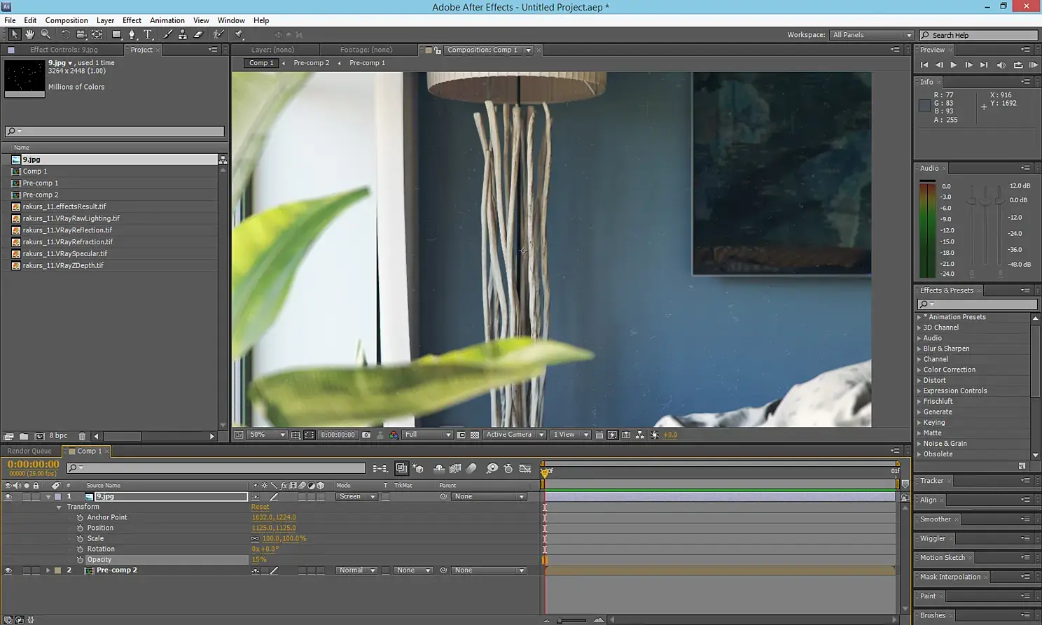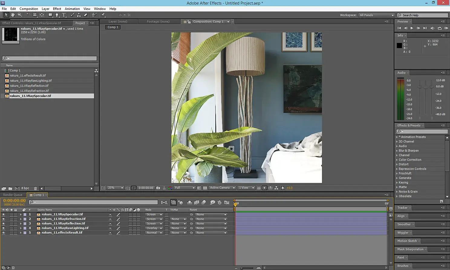 Рендер элемент VRayRawLightning накладываю на основное изображение в режиме смешивания overlay и устанавливаю прозрачность от 20 до 50 процентов. Остальные рендер-элементы накладываю в режиме смешивания screen, прозрачность также выбираю от 20 до 50 процентов.