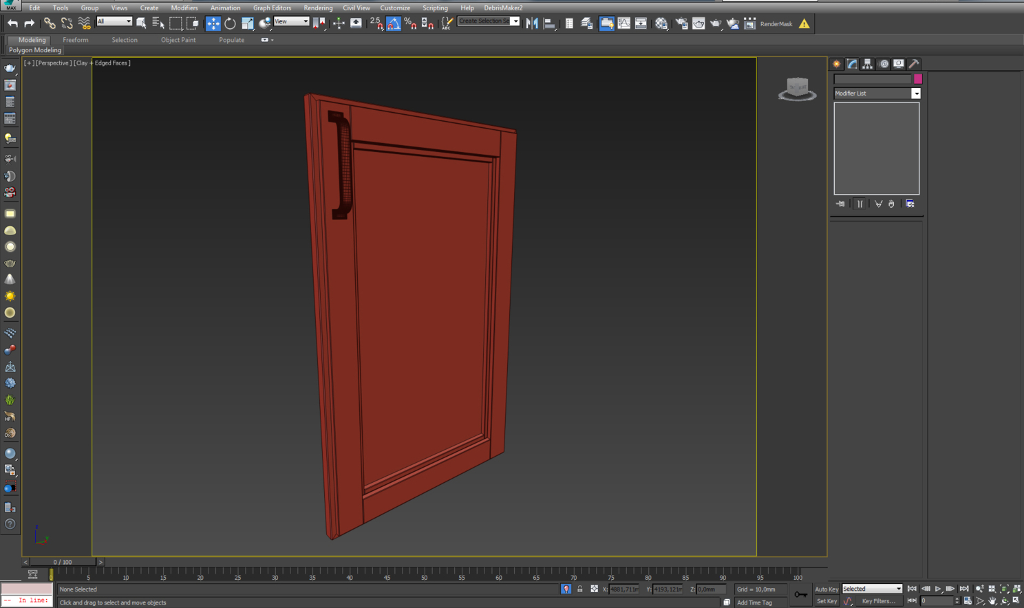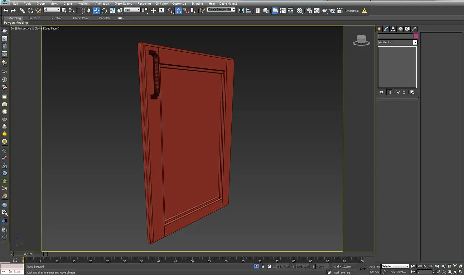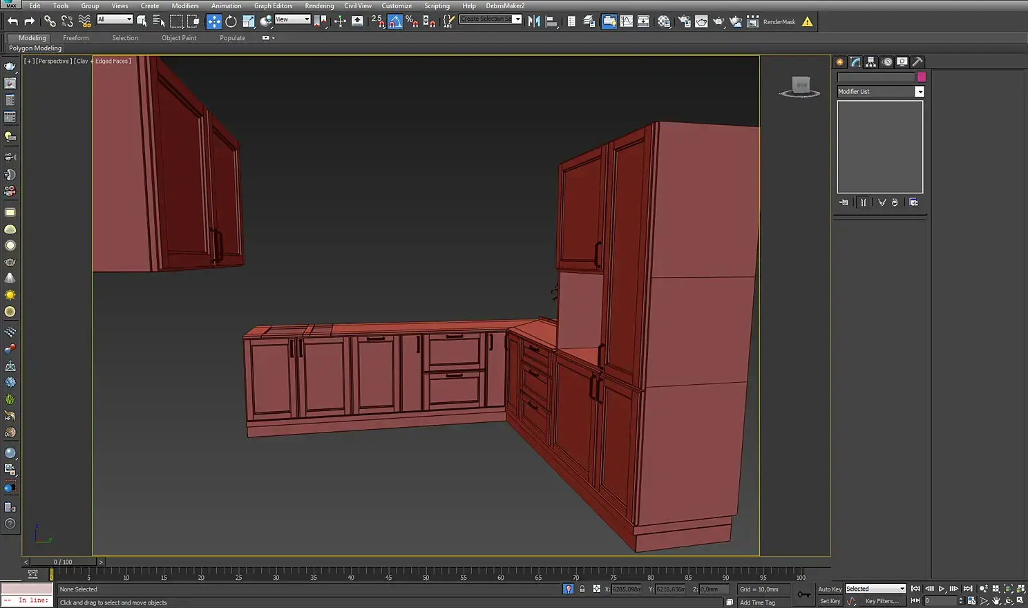 После построения «коробки» я перешел к моделированию кухни. Ее делал с помощью боксов и модификатора chamfer. Ручку также делал из бокса, придав общую форму, применил к ней модификатор turbosmooth.