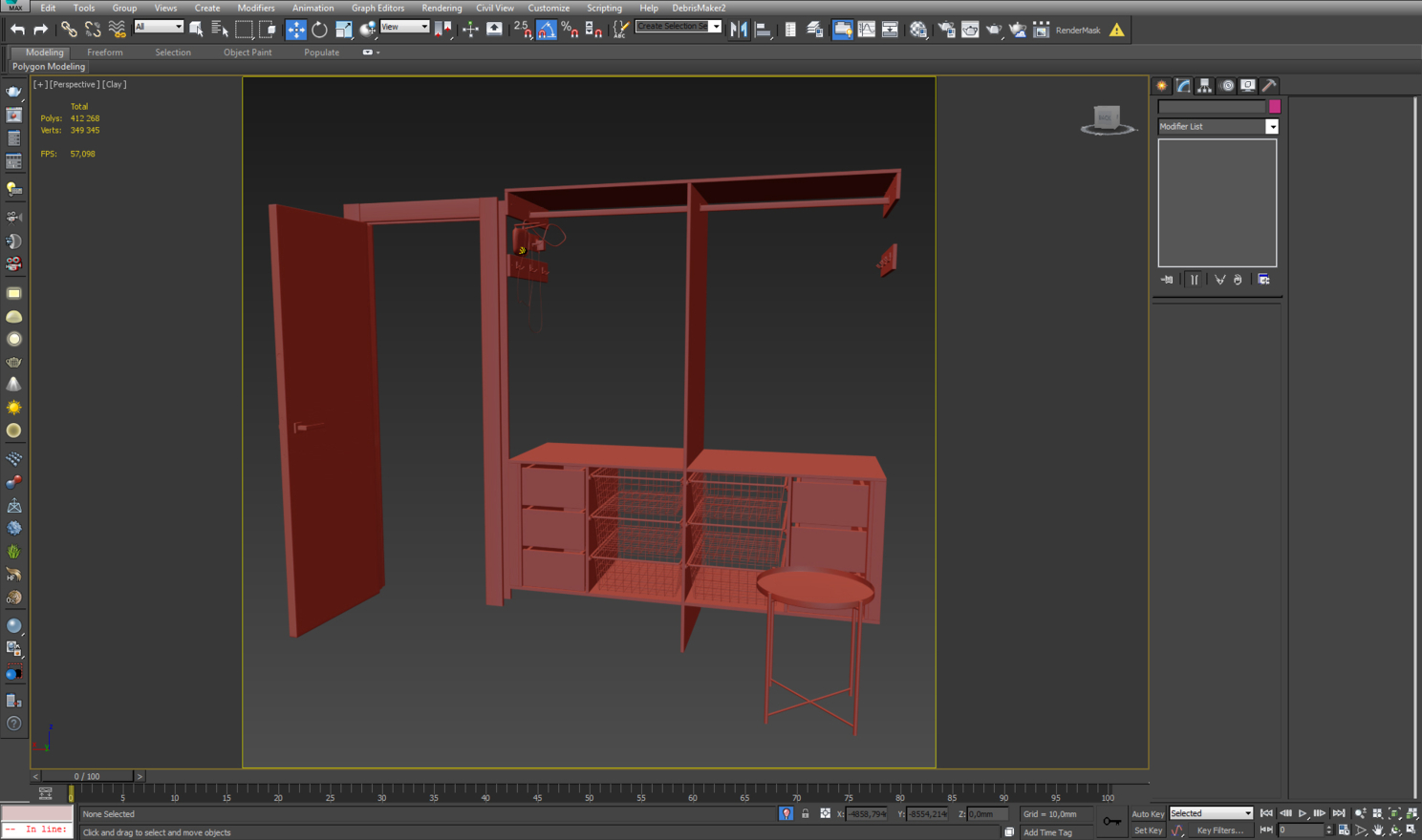 После этого я занялся наполнением помещений мебелью и декором из готовых моделей с 3ddd, согласно задумке дизайнера (коим являлась моя жена). Одни модели вставлялись в сцену без изменений геометрии, другие подгонялись по размерам с помощью ffd модификатора (например, диван), третьи правились и приводились к необходимому виду (например, дверки шаттерсы).