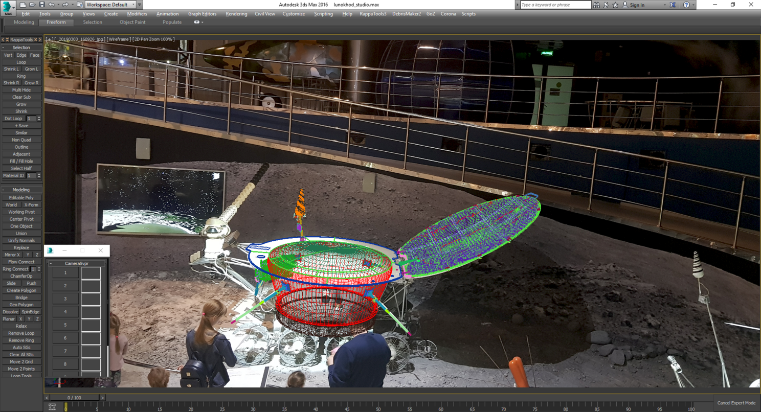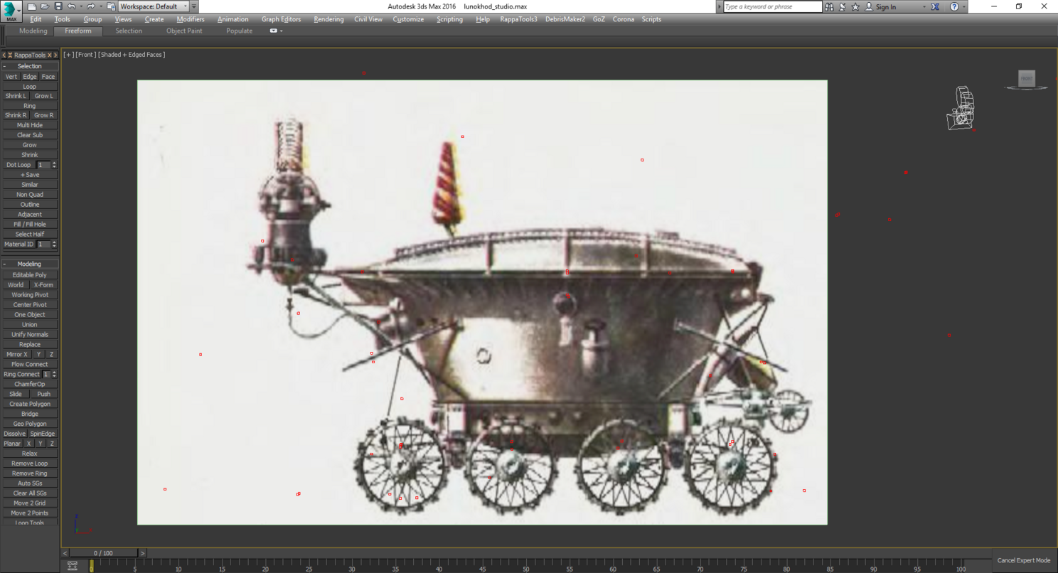 Я сгруппировал это безобразие, и т.к. я знаю габариты Лунохода, и у меня есть картинка с его проекциями, я повернул группу как нужно, и подогнал масштаб.