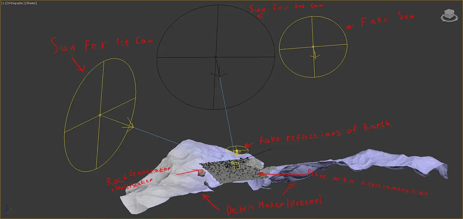 Для задних планов, я использовал поверхности, созданные при помощи плагина DebrisMaker тип - Meteor