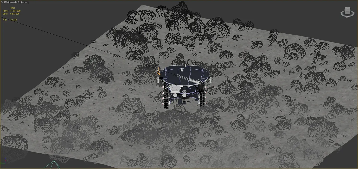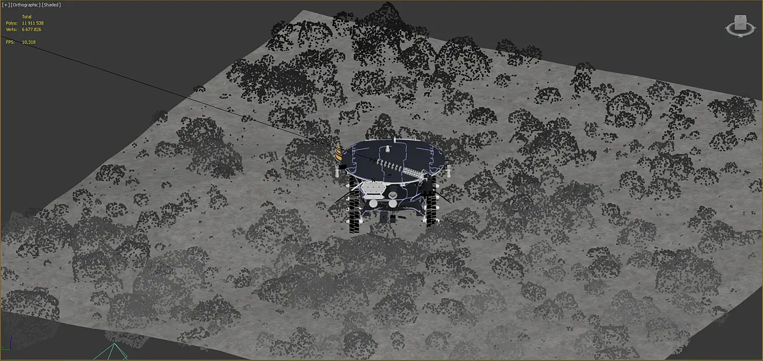Основная поверхность (на которой стоит Луноход) - это плоскость, с примененным модификатором VrayDisplacementMod. В качестве карты displace выступает карта грунта: