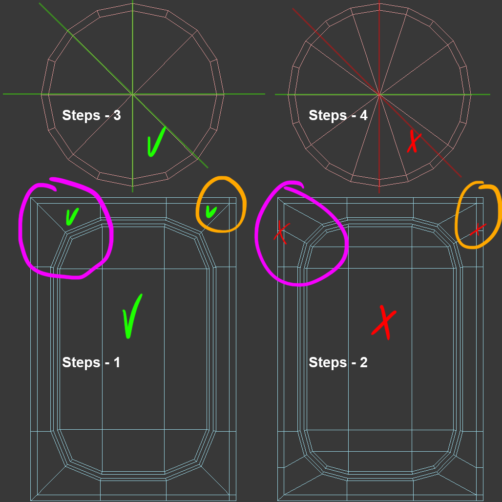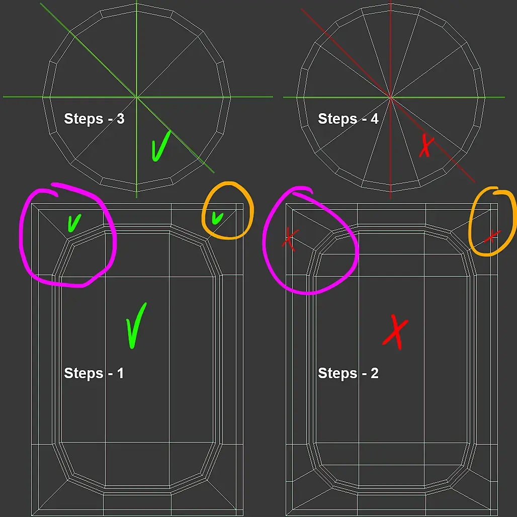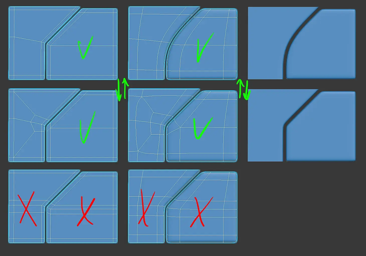 Теперь расскажу про углы. Топология у них будет отличаться, в зависимости от того, плавный или резкий переход вы хотите сделать. Но переделать один в другой, и обратно, не составляет труда: