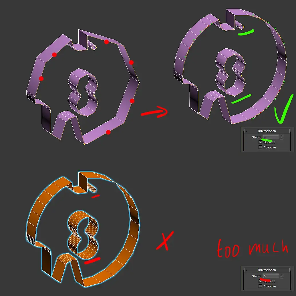 И еще момент. Всегда используйте нечетное число в параметре Steps. Иначе, не получится использовать симметрию и не получится правильно разбить на четырехугольники. Вот пример поверхностей, полученных из сплайнов, с разным числом Steps: