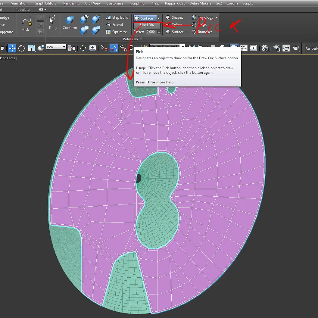 Выбираю Draw on:Surface, жму Pick, и выбираю свою поверхность, на которую нужно проецировать: