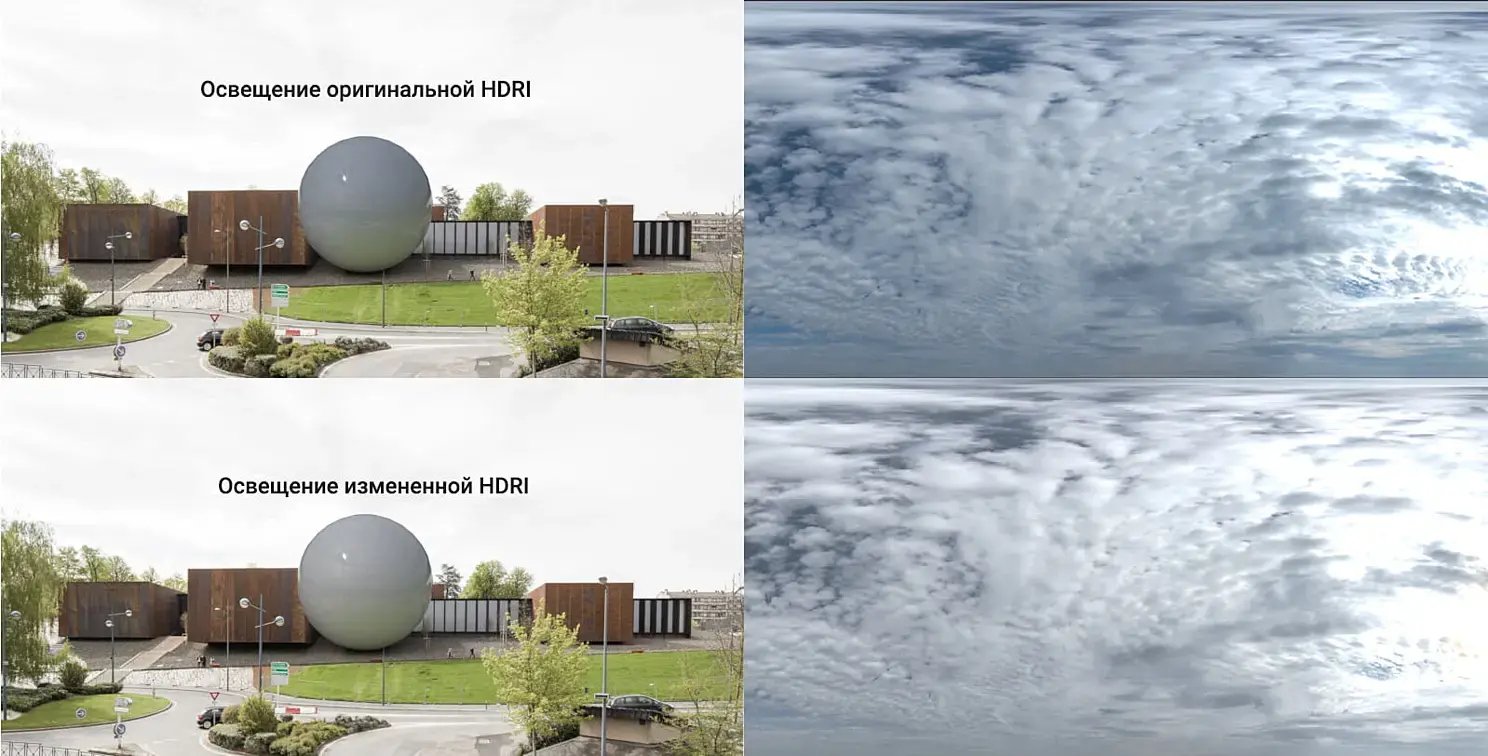 Основным в настройке освещения является подбор hdri и дальнейшая ее коррекция. Я выбрал самую подходящую из того что имел — это cloudy с CG-Source.