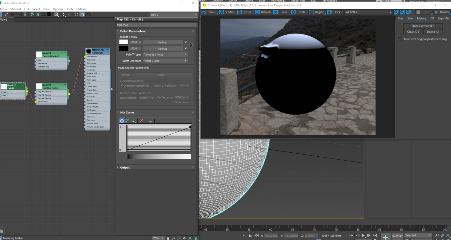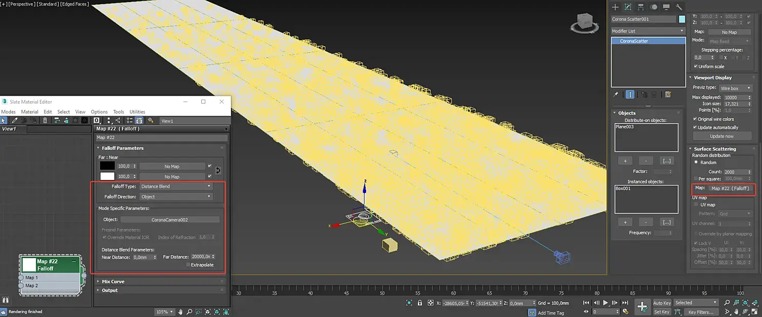 Я уверен многим знаком режим распределения объектов в Forest pack, который при отдалении от камеры уменьшает плотность инстансов. Так вот. Подключив карту falloff в слот distribution в corona scatter вы получите тот же эффект.