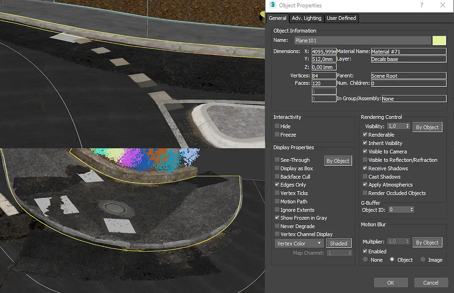 Здесь я использовал основную бесшовную монотонную текстуру от poliigon, а для добавления деталей поверх накладывал текстуры friendly shade с различными дефектами. По факту тут нужна отдельная статья для описания всего процесса создания дороги, но вкратце расскажу основные моменты. Для начала я сделал развертку через unwrap uvw, чтобы при поворотах текстура также следовала за направлением дороги. Для всякой грязи можно использовать ту же развертку, но с uvw xform с указанием другого канала, либо пару uvw map поверх накинуть. Далее создал сплайны из контуров дороги, которые затем послужат маской через corona distance, и сплайны для колеи и следов от шин. А подключение карты corona distance к bercongradient дает вам неограниченные возможности в настройке маски (об этом приеме я узнал из ролика vray, где они показывали, как сделать чайные подтеки на бумаге от стакана).