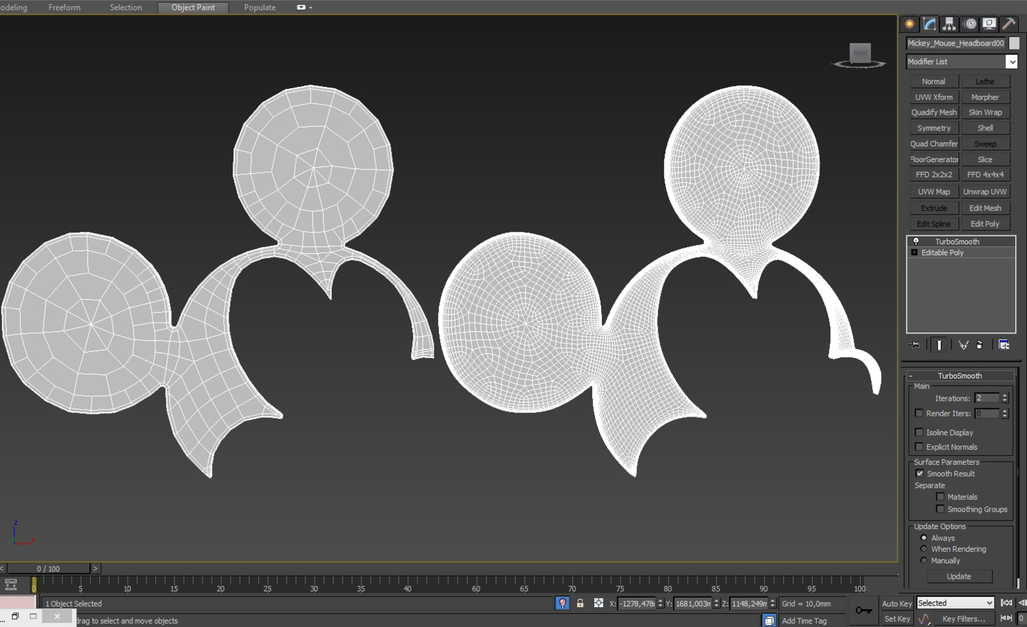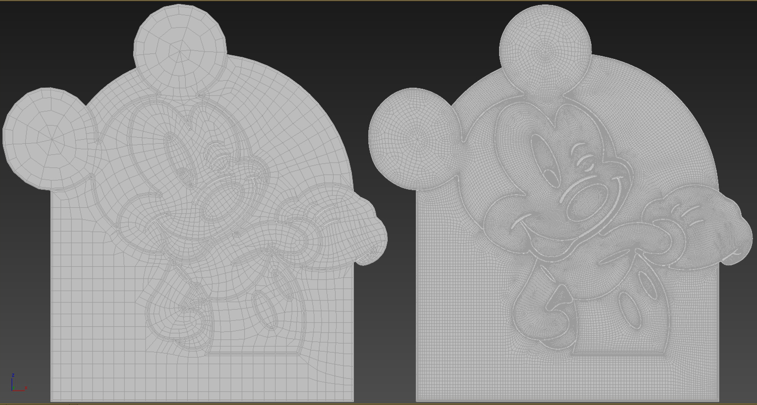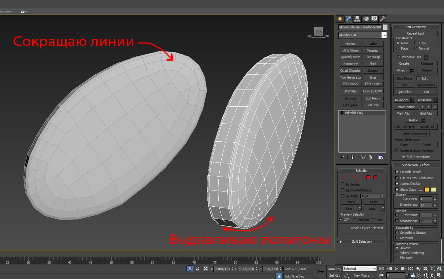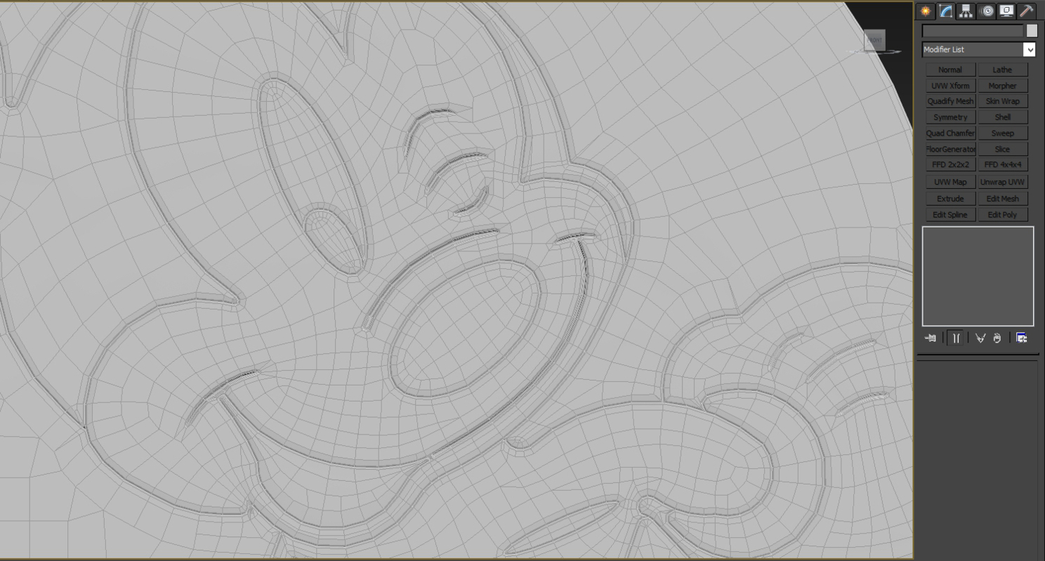 На картинке выше - "носик", далее сложнее... например ушки. Тут можно наблюдать более детальное сокращение линий, это необходимо для снижение веса модели, что бы сетка не была плотной. Так же нужно учитывать моменты которые отвечают за "каркас модели". После применения TurboSmooth модель должна сглаживаться и не деформироваться.