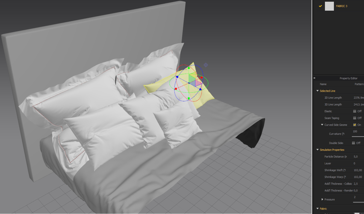 Подушки, тут вопрос в количестве, если много, можно в два захода, сделал одни, закинул как аватар, делаешь другие. Сшиваем, симулируем, надуваем, и каждую по отдельности просчитываем с маленьким Particle Distance. "Из тонкостей" скажу, заднюю часть подушки нужно надувать сильнее, управлять ею будет легче.