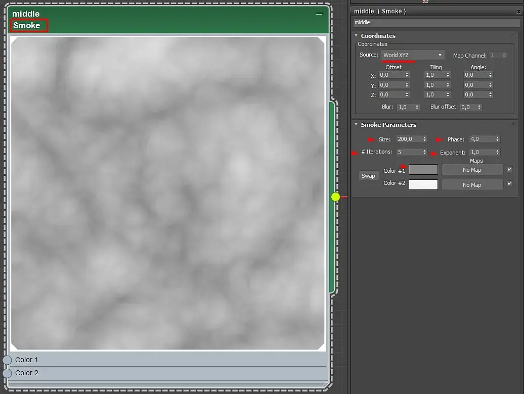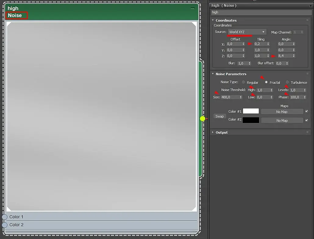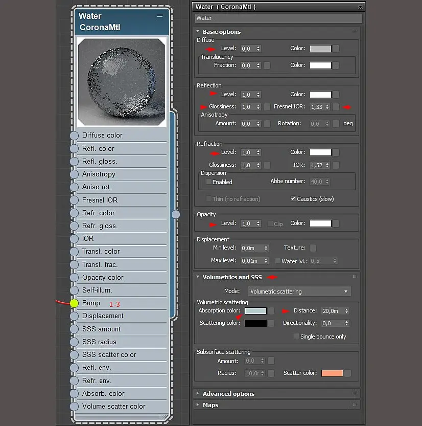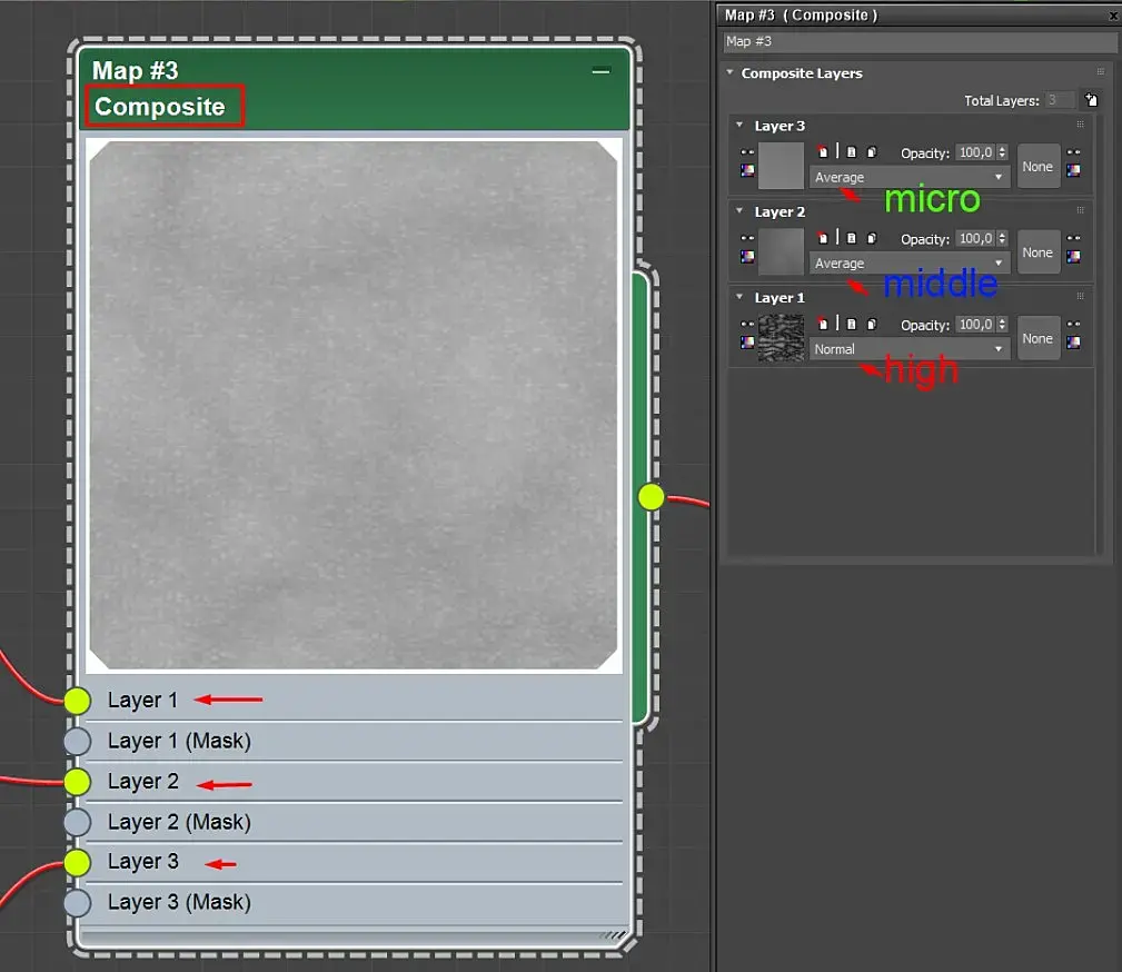 Для имитации трех типов поверхности мы используем три карты смешанные через композит и отправленные в Bump материала воды.