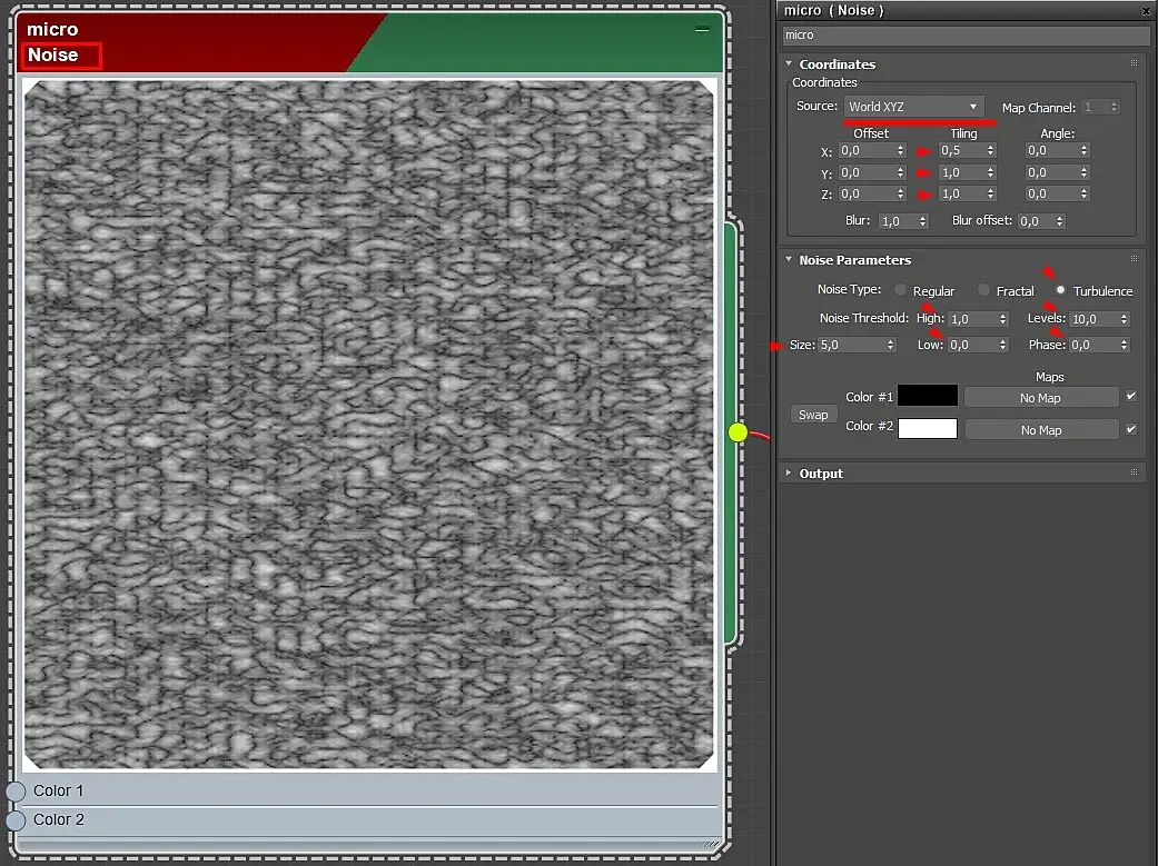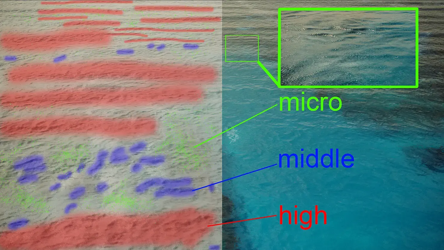 Разберем компоненты из которых состоит неровность водной поверхности. Их всего три, маленькая рябь(micro), средняя рябь(middle) и рандомная высота волн (high).