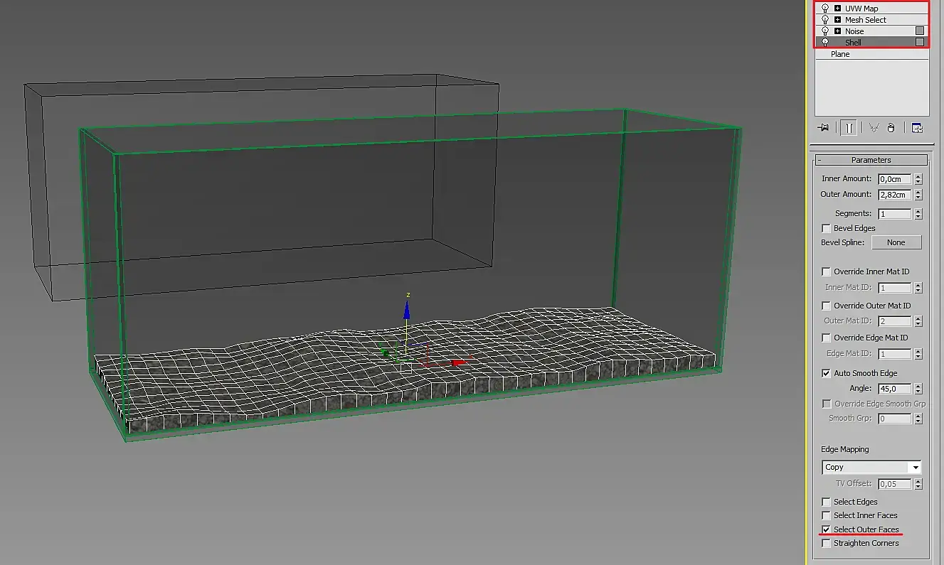 К этому Plane применил модификатор Shell, нажав галочку Select Outer Faces, затем накинул Noise, настроив, как мне надо, потом Mesh Select (чтобы скинуть выделение верхних полигонов) и UVW Map: