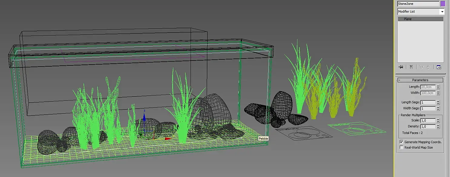 "Методом 2" сделал Plane, у которого отключил видимость для рендера и сделал отступы от стенок побольше, чтобы камни и растения не пересекали стёкла и по ней распределил с помощью Corona Scatter заранее заготовленные образцы: