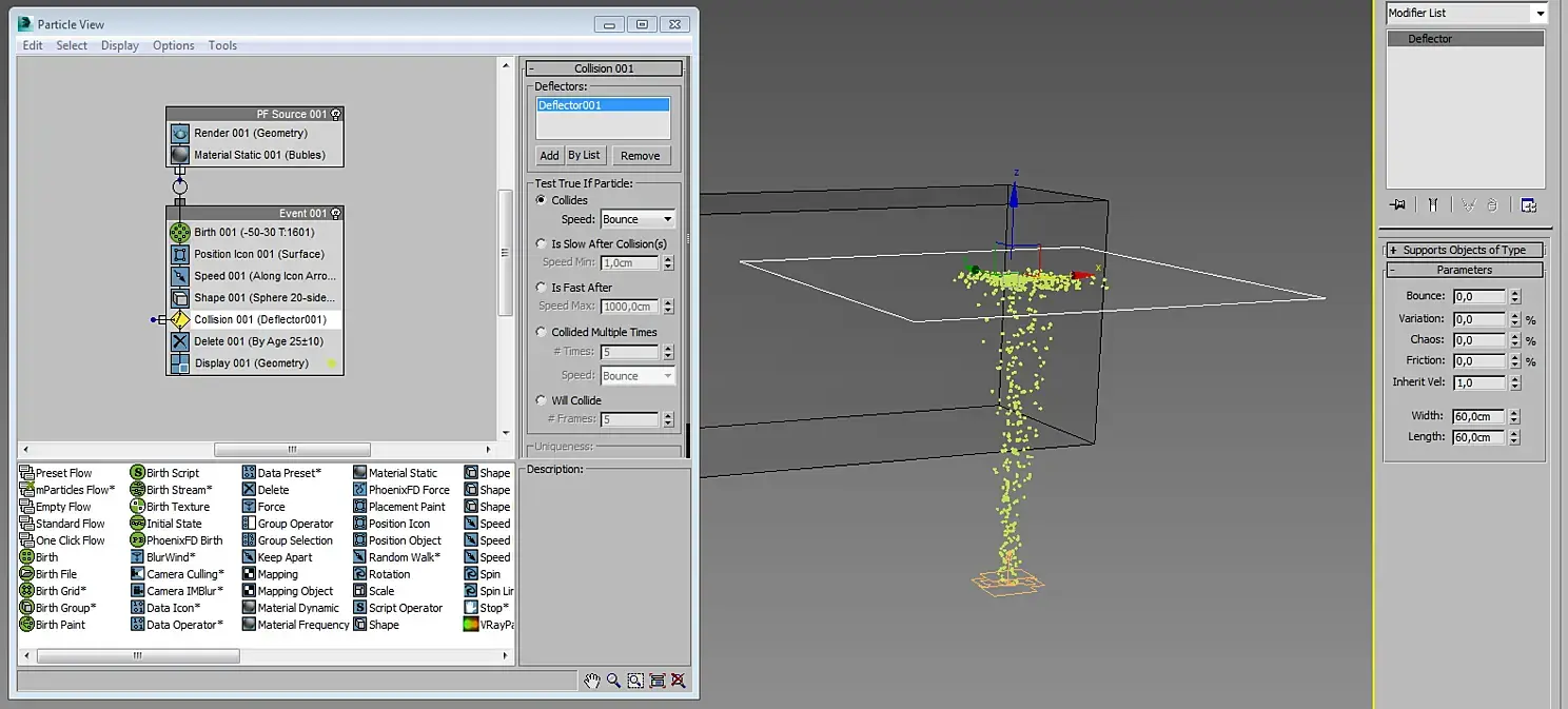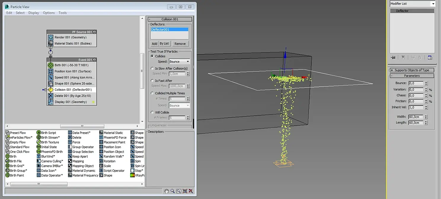 Сделал в PFlow. Сильно не буду объяснять, там всё достаточно просто. Единственное что я привязал высоту Deflector001 к базовому боксу так, чтобы он находился на поверхности воды: