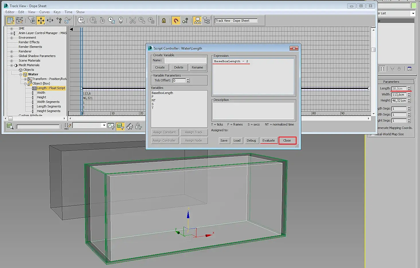 Теперь наш параметр BaseBoxLength будет выражать длину базового бокса, мы можем использовать её для любых арифметических действий. В поле Expression вводим формулу "BaseBoxLength - 2", чтобы длина бокса воды была на 2 см. меньше. Можно нажать Evaluate, чтобы увидеть наглядно изменения. Теперь длину Water нельзя изменить вручную (этот параметр у неё будет серым) и привязан к длине базового бокса.