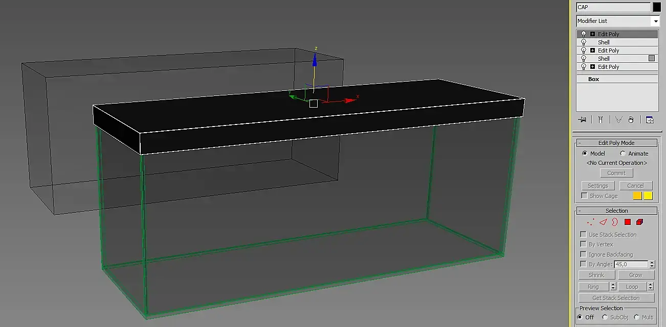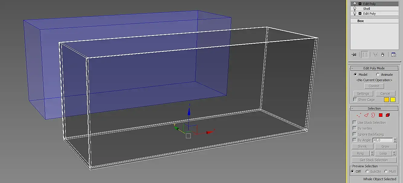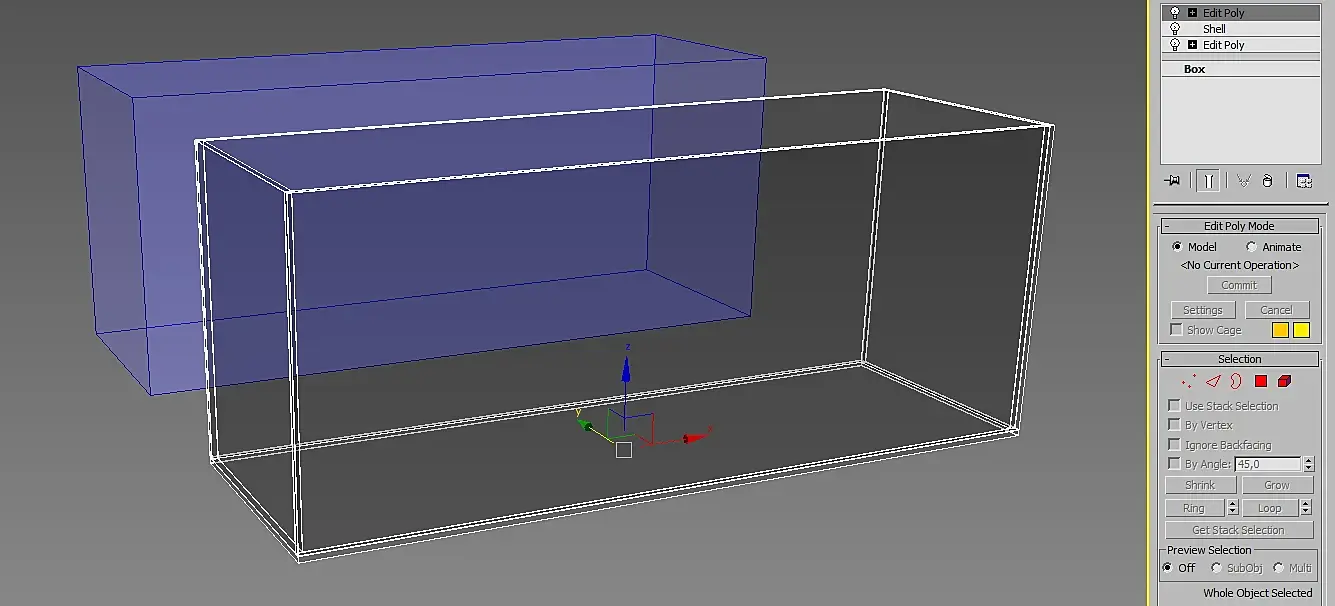 Копируем бокс как Reference (Glass) и не сложными манипуляциями, разрезая и двигая грани, накладывая Shell и делая фаски, создаём стеклянный ящик. Reference использует первоначальный объект как и Instance, но его плюсом можно независимо от исходного объекта модифицировать, накладывая модификаторы выше разделительной линии: