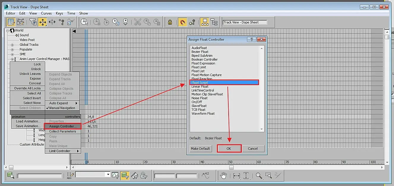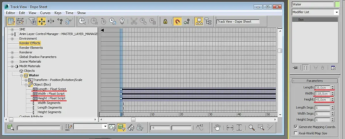 Откроется TrackView, где нам надо найти нашу воду (обычно выделенный объект подсвечен жёлтым), по параметру Length (Длина) кликнуть правой кнопкой и выбрать Float Script:
