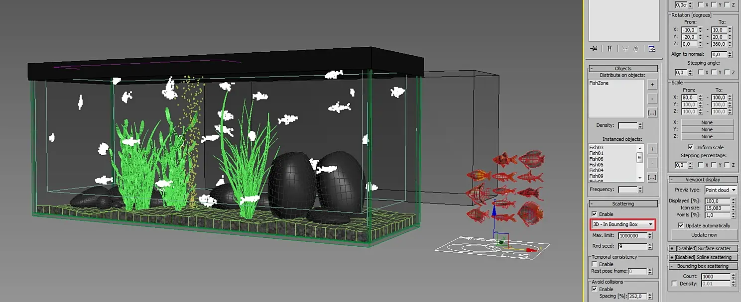Теперь можно запускать рыбок. Сделал вспомогательный бокс, привязав методом 2 к базовому боксу, отдалив чуток от стенок и дна и в него распределил заранее смоделированных рыбок с помощью Corona Scatter: