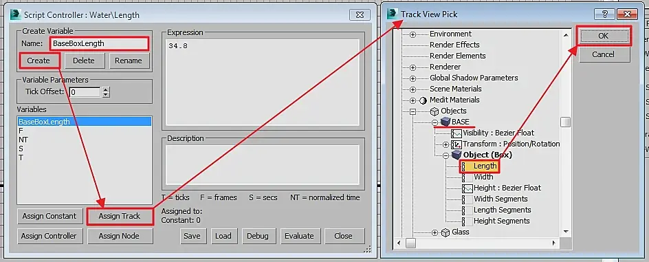 В поле Name надо придумать имя для переменной длины базового бокса (BaseBoxLength, например) --> Create --> Assign Track, откроется окошко TrackView Pick, где надо найти наш базовый бокс, найти параметр длины и кликнуть OK: