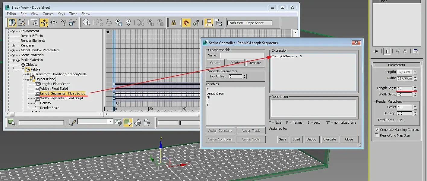 Теперь можно сделать камушки на дне. Я создал Plane на нужной высоте, привязал ширину и длину к базовому боксу, уменьшив их на 2,04 см (по 1,02 см с каждой стороны). Так же можно привязать любые параметры, в том числе и количество сегментов по длине и ширине: