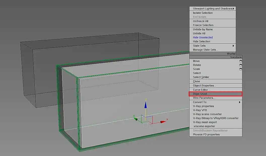 Мне надо, чтобы вода была на 1 см меньше базового бокса в районе стёкол и на пару сантиметров ниже по высоте. Копируем (Copy) базовый бокс в центр аквариума или создаём новый (Water), поднимаем вверх на 1 см., жмём правой кнопкой на нём и выбираем Dope Sheet: