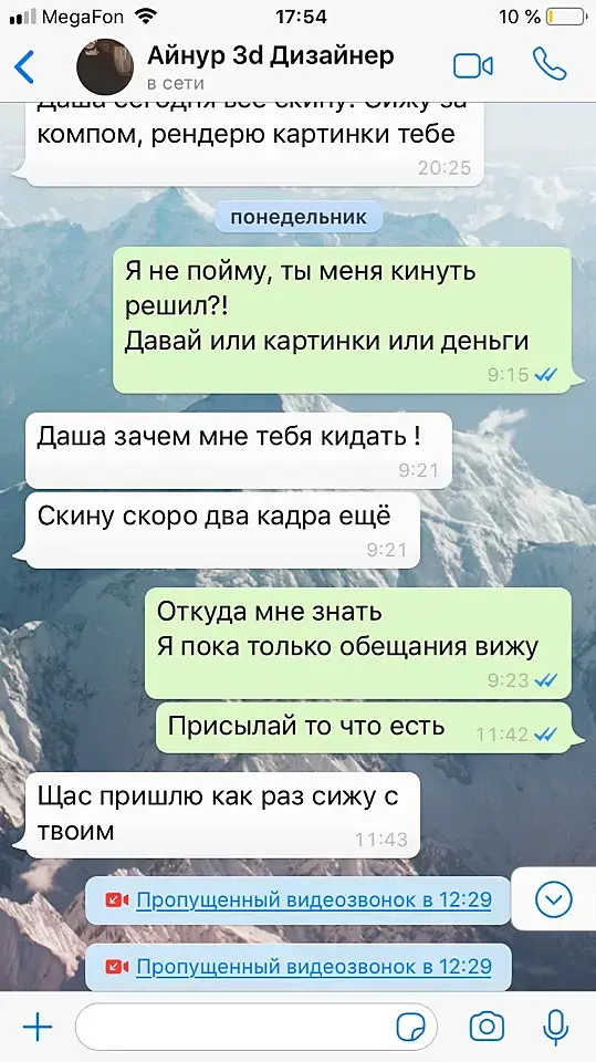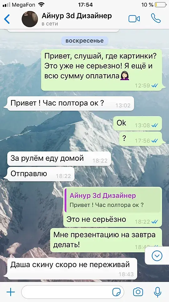 На все просьбы показать на каком этапе работа было молчание или "вот вот скину". Попросили мы его 18 марта, а 23-го уже ни сил ни нервов не осталось. Все эти дни сплошные обещания, "вот вот, чуть-чуть, еще два часа и скину".