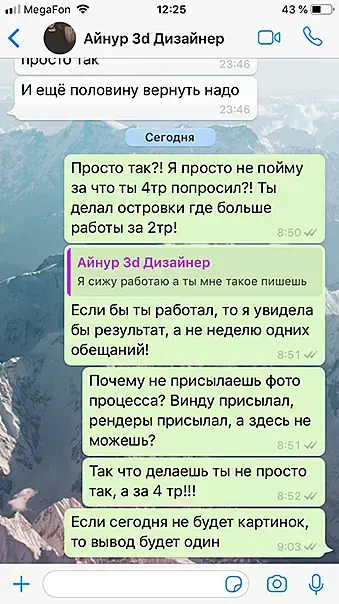 Теперь уже ясно, что Айнур решил зарабатывать просто на доверии, лишний раз не напрягаясь выполнять свою работу.На просьбу вернуть деньги или прислать картинки, было возмущение что он работает, а я такое пишу, и он вообще просто так это делает, оплатили же мы за другое.