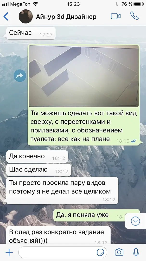 И вот, в третий раз, 13 марта 2019, нужна была визуализация большого помещения. Задание было сделать наружные вывески на фото и два ракурса внутри, он поосил 4000руб; само по себе дорого, но так как мы немного не правильно сформулировали задание, была отчасти наша ошибка. Он сказал - работы на два дня. Дали предоплату. На следующий день, 14 марта, он попросил еще 2 тыщи, что бы оплатить кредит.