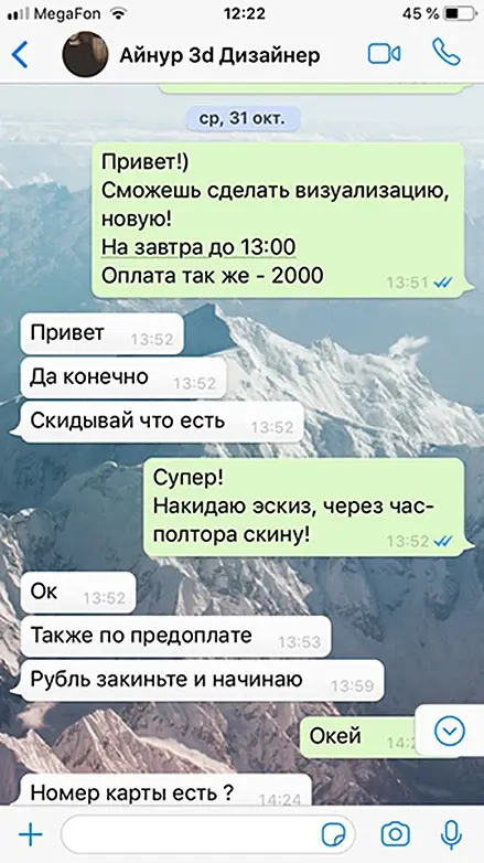 Никогда бы не поверила, если бы лично не столкнулась с такой ситуацией. 3d-дизайнер с которым я работала через сервис YouDo, а потом еще раз, через личное обращение были довольно успешны. Правда, каждый раз он просил то раньше закрыть задание на YouDo, то перечислить деньги до завершения задания, потому что "срочно нужно оплатить кредит". Деньги я перечисляла, на свой страх и риск. Оба раза я заказывала 3D визуализацию кофейного островка, за это он брал 2000 рублей.