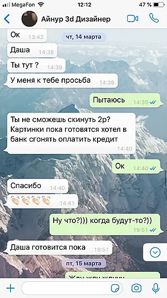 Как теперь понимаю, он и предполагал в начале, что это от него и требуется поэтому попросил такую сумму. Но вот делать уже, после того что УЖЕ сделано, он не захотел. Конечно, Айнур Халиков, согласился быстро и легко сделать нам все помещение. 20-го марта он написал что "наконец-то все отстроил", "ну присылай" был ответ, на что....поступила просьба дать в долг 1000 рублей! ЧТО?!