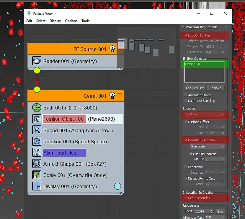 6) В свитке if location is invalid — ставим галочку delete particles — в дальнейшем это удалит все партиклы которые ошибочно возникли в местах исключенных из генерации маскированием.