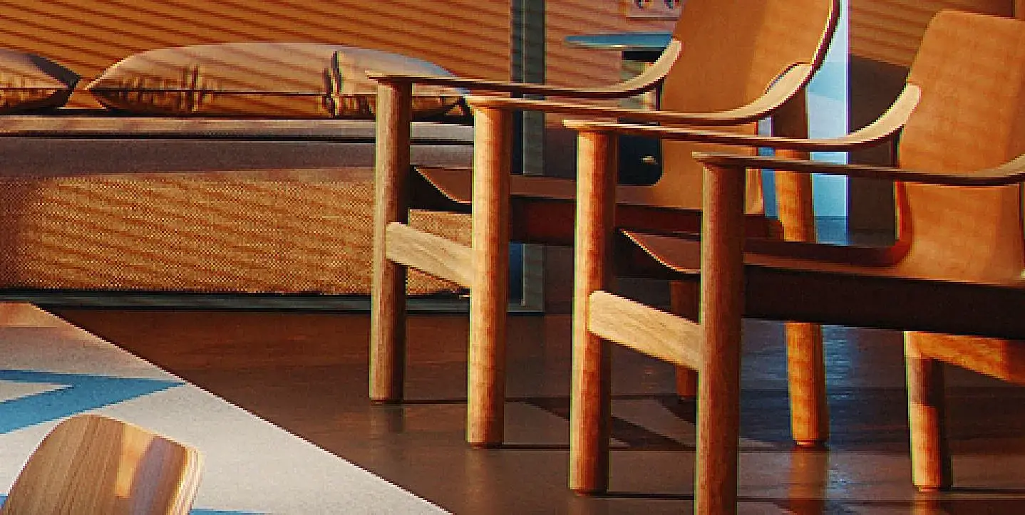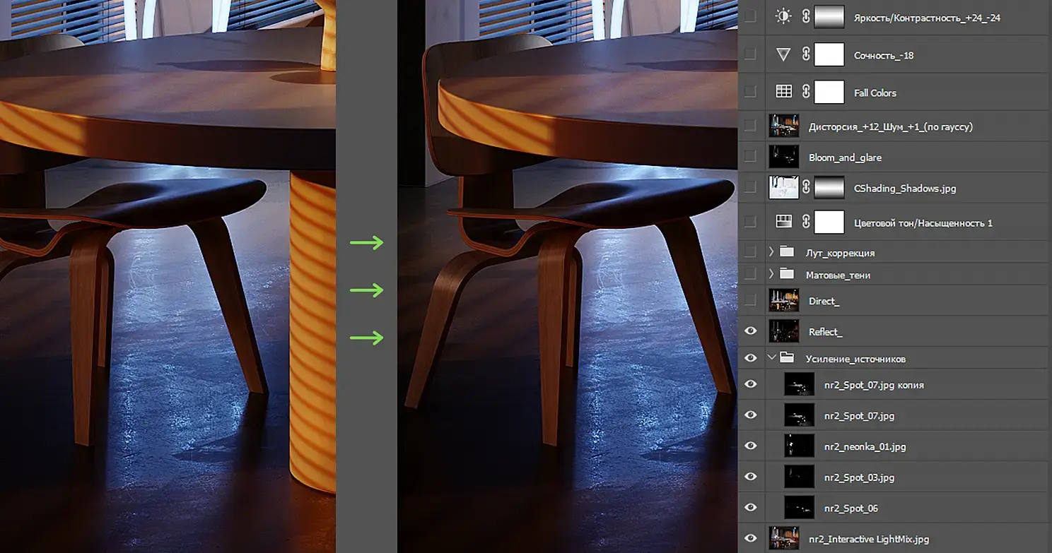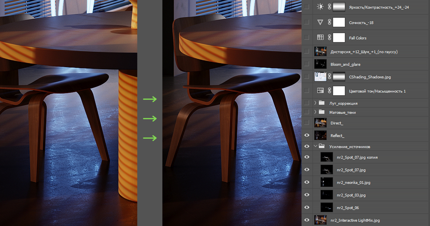 * Через режим наложения "Осветление основы" добавил канал reflect на 12% заливки. Это позволило подчеркнуть блик под стулом в углу слева: