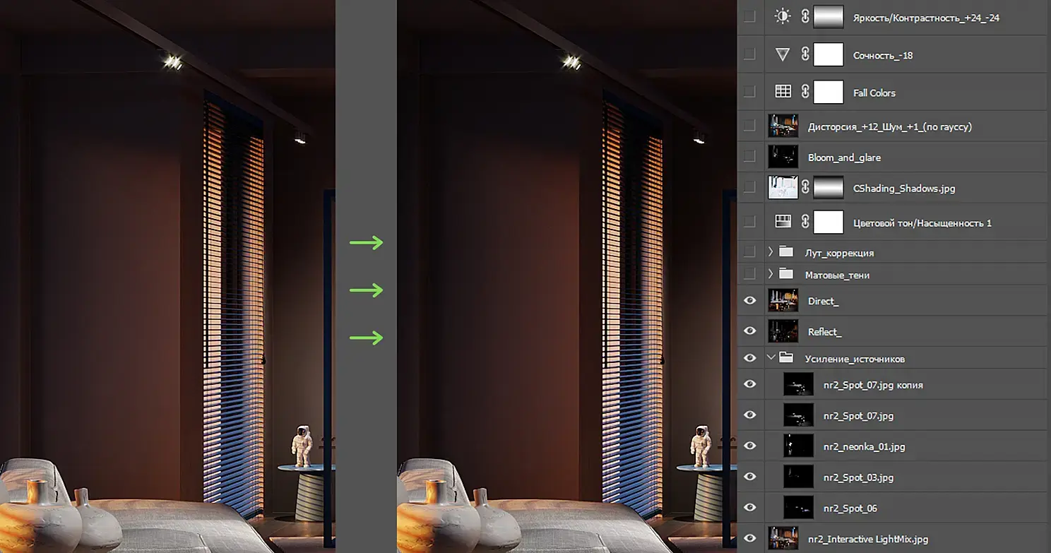 * Начал с усиления некоторых источников света. Через режим наложения "Экран" и "Осветление основы" вытянул те зоны, которые казались мне недостаточно светлыми.