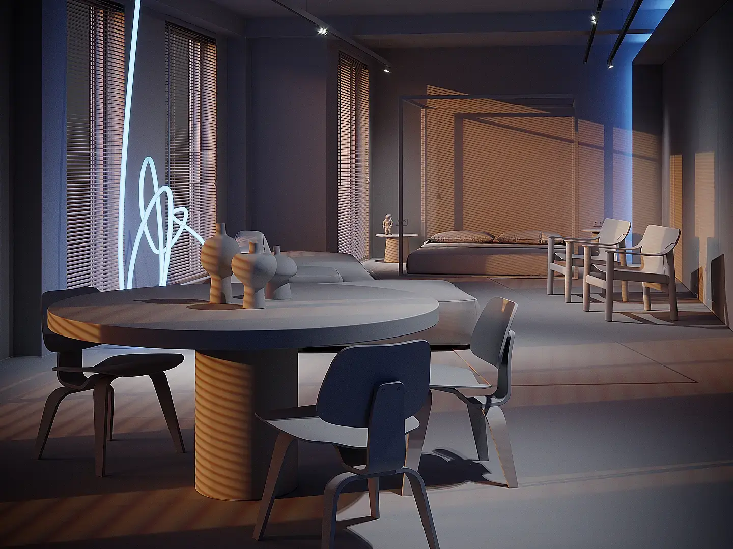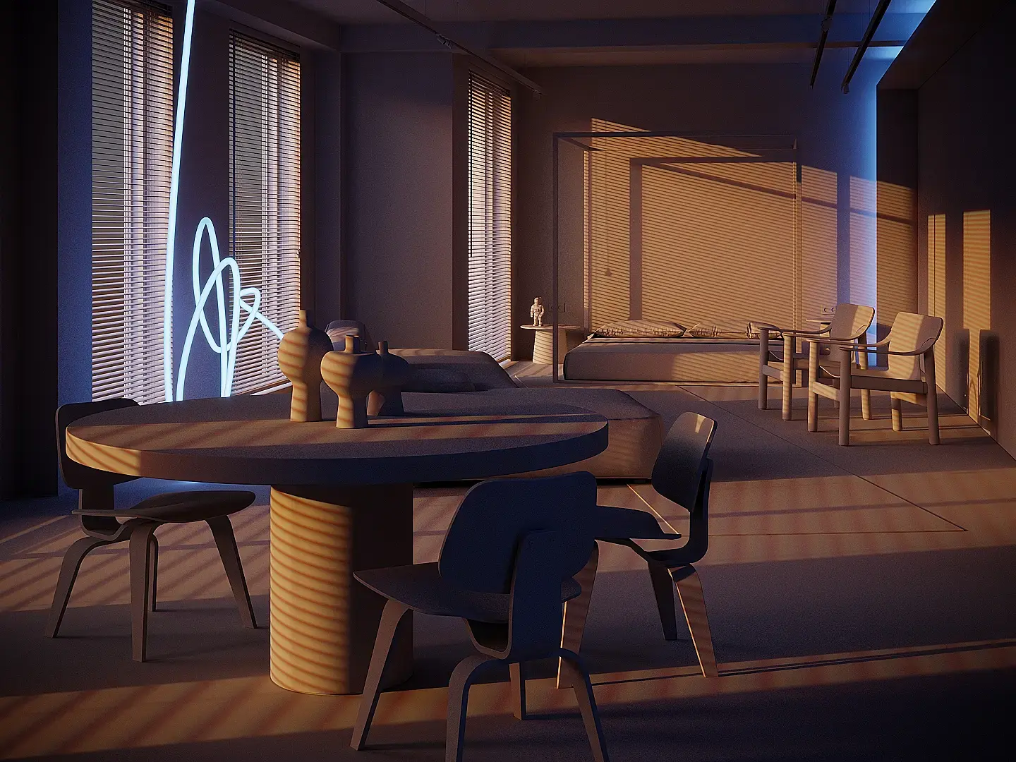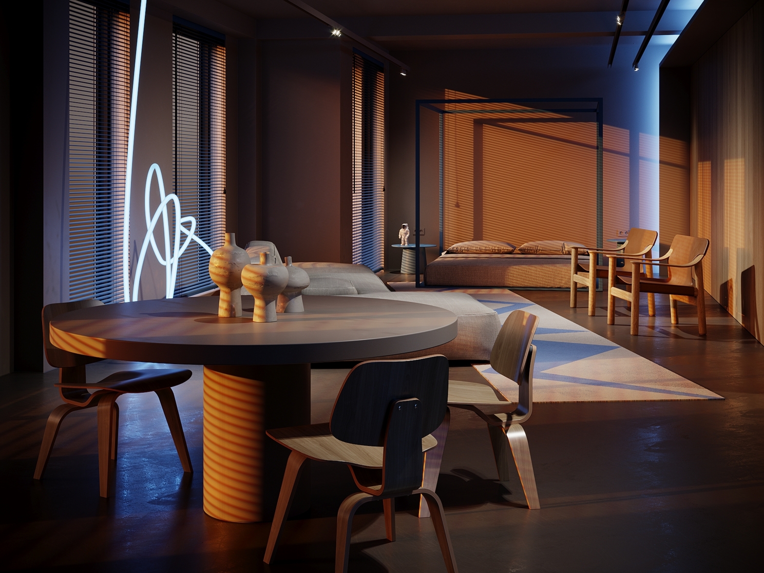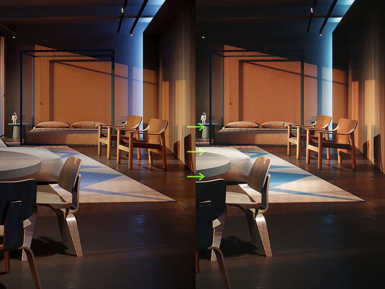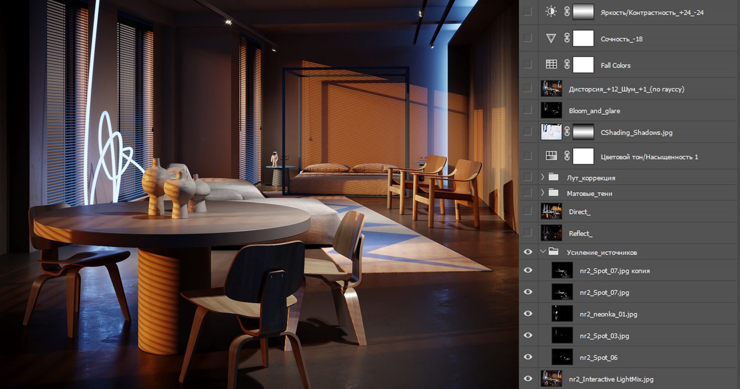 Подсветка потолочной ниши и неоновый светильник изначально планировались теплыми, но оценив общее настроение кадра было решено не уходить в желтушность и сделать избитую, но такую приятную глазу цветовую схему Teal and Orange. Всей душой эту схему ругаю, но как же хорошо она ложится в контексте закатного освещения. * Попутно с подключением новых источников корректировал яркость hdriкарты.