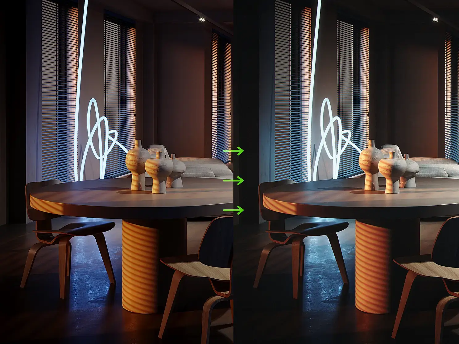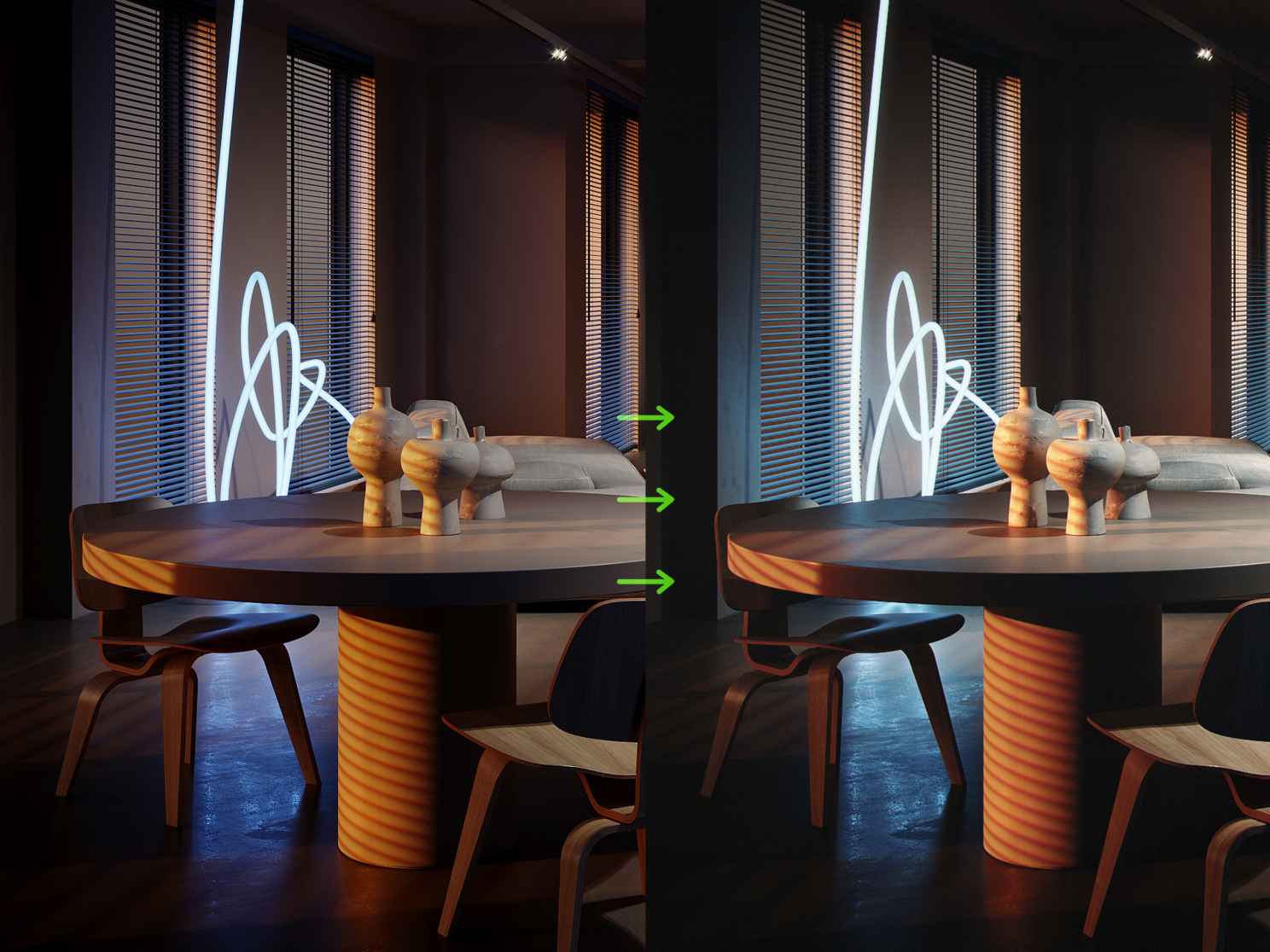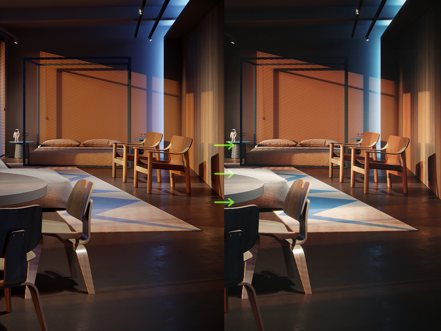 В свиткеTONE MAPPING в Corona VFB довольно агрессивно крутил параметры Filmic highlights и Filmic shadows. А именно выкрутил и первый и второй до значения 1.0. Ни о чем не жалею. А зачем я так сделал можно увидеть на примере ниже: