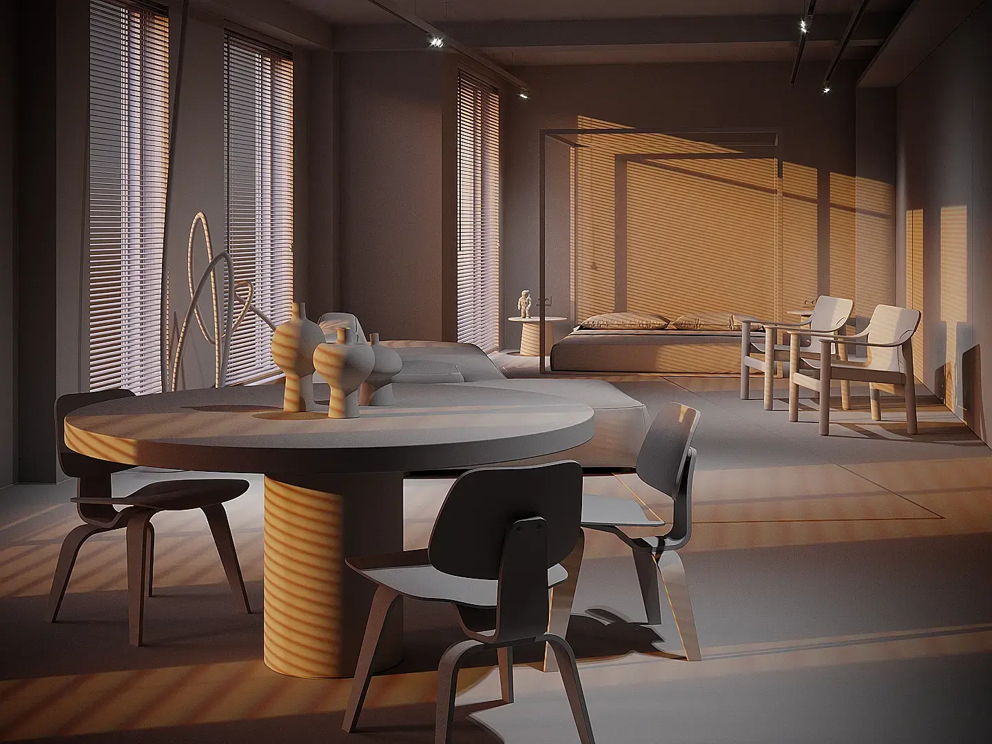 Легкая (да где там) топорность мне не помешали. Рисунком света я остался доволен и перешел к этапу более точечной настройки освещения. Задачей было не только порендерить "красивенькие лучики", но и показать пространство, выделить важные зоны и зацепить внимание потенциального зрителя.