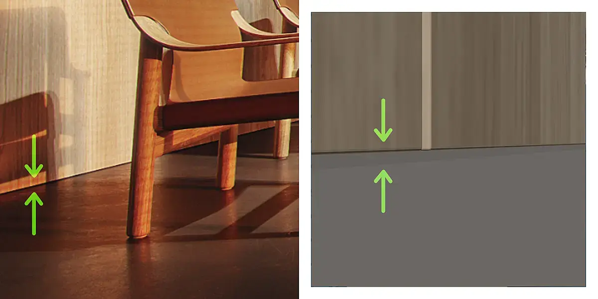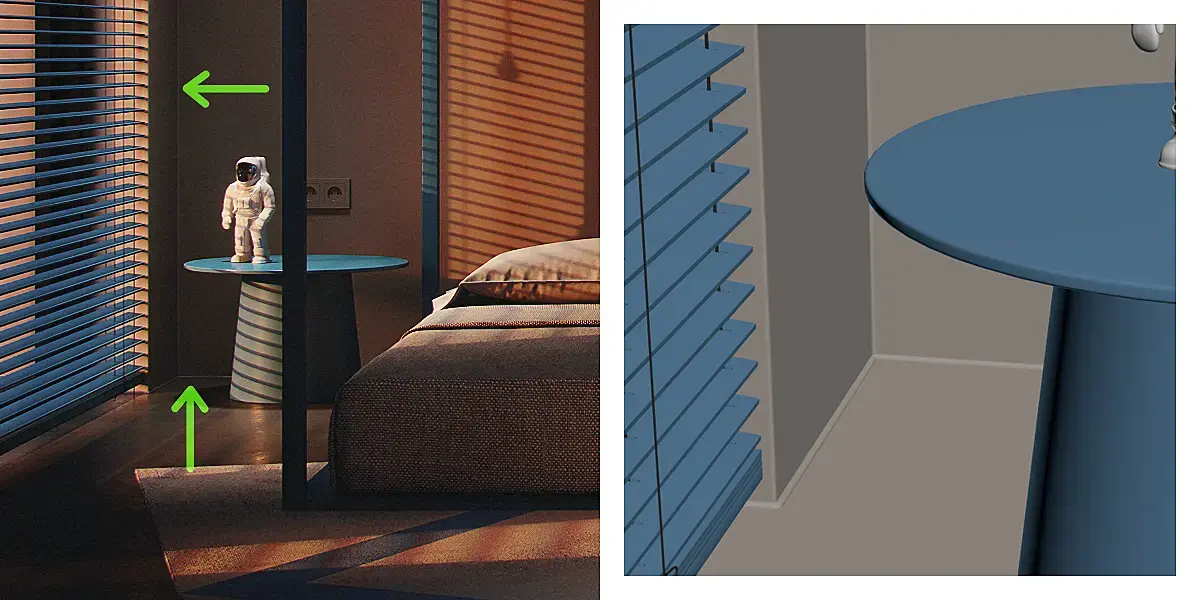 * Небольшая фаска на внутренних и внешних углах, сопряжение пола со стеной. Элементарные действия, улучшающие поведение бликов от источников света в сцене.