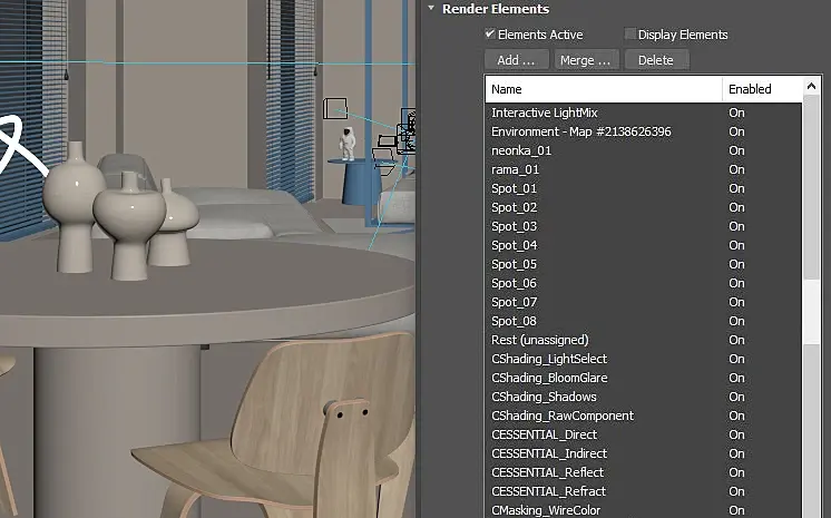 Я разделил источники света по отдельным группам. Добавил основные в работе каналы Relfect и Refract. Маска WireColor в последствии мне не пригодилась вовсе, хотя я планировал уделять многим объектам отдельное внимание.