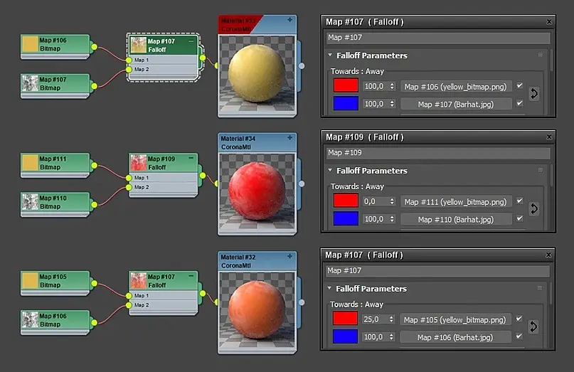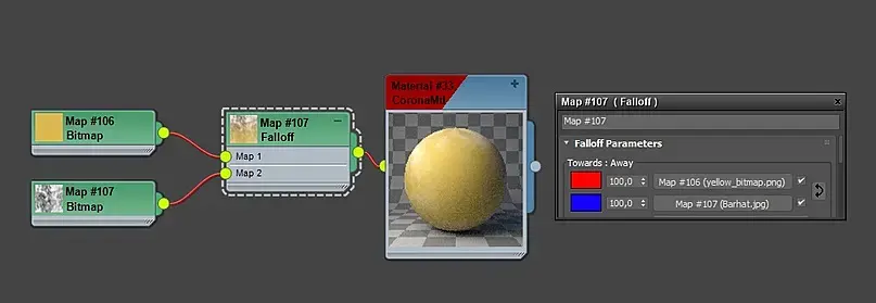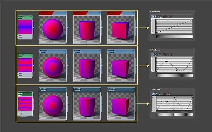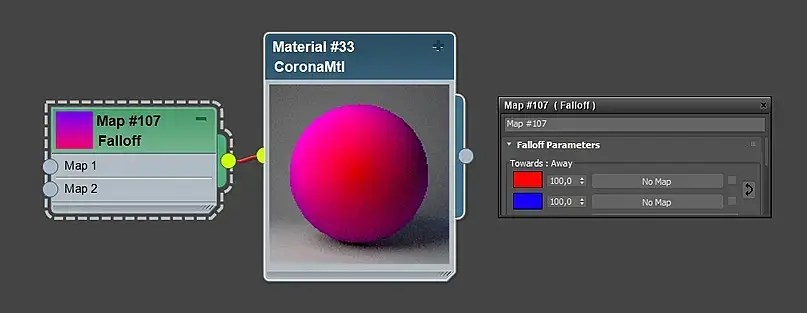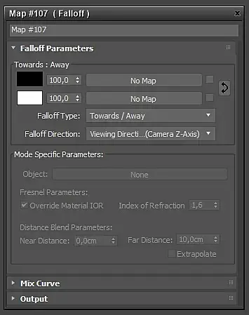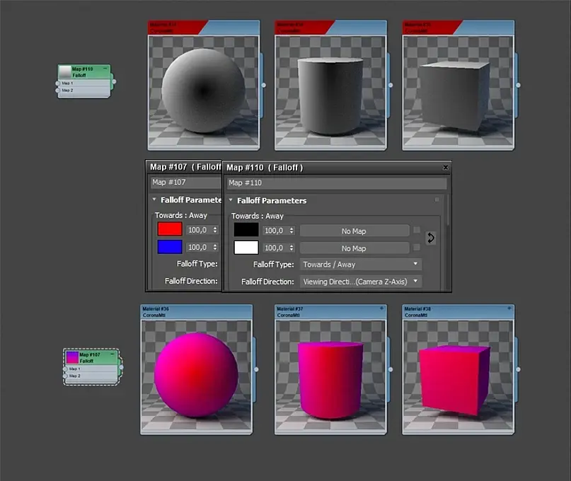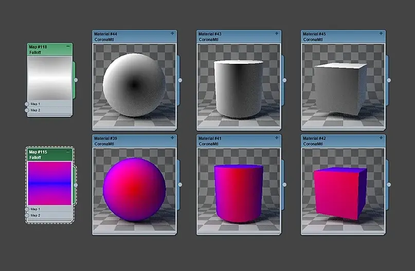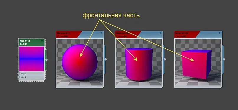 Falloff - создает переход от белого к черному цвету(или аналогично можно выбрать другие желаемые цвета), исходя от углов спада поверхности объекта по отношению к положению камеры. Где плавность или резкость перехода зависит от настроек.