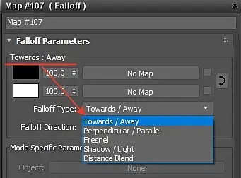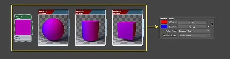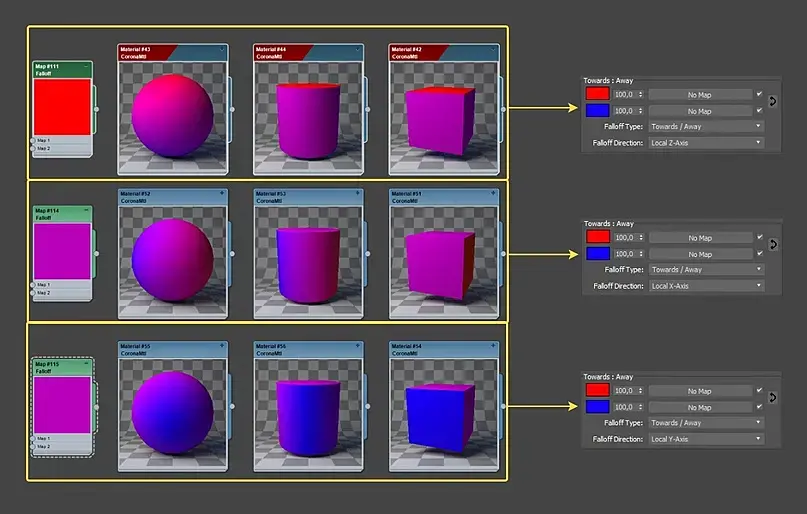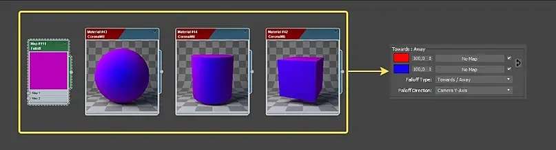 Происходит направление спада(Falloff) относительно оси Z камеры. То есть цветовой диапазон, перехода от фронтальной (передней) части объекта до тыльной(задней) части объекта (не забываем, что взгляд на объект происходит от лица камеры или Perspective).